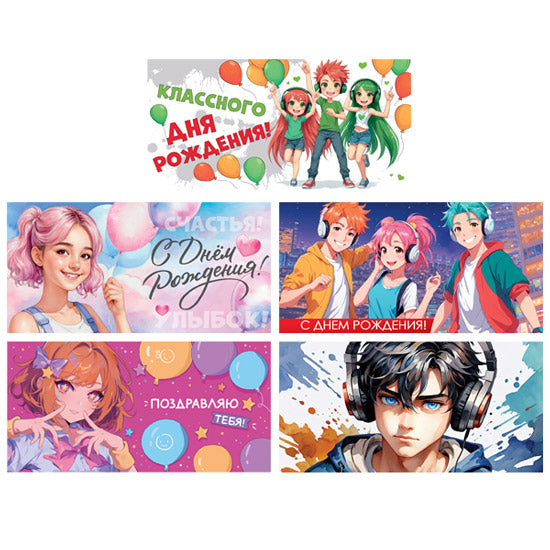 *КД-17597 Комплект конвертов для денег на склейке. Классного дня рождения! (5 шт., аниме)