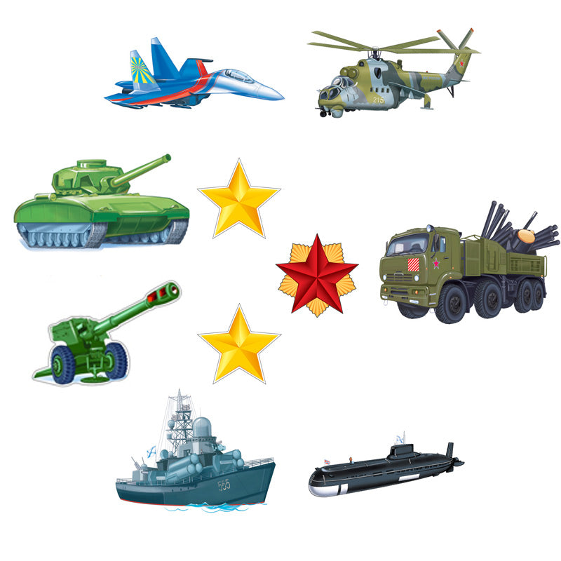 *КМ-16265 Комплект для оформления интерьеров. Военная техника (10 фигурок: 7 видов военной техники и звезды)
