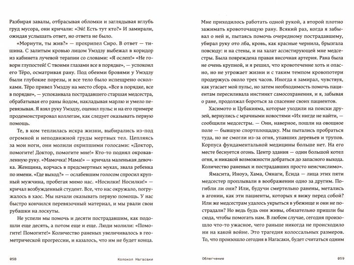 Когда 9 августа 1945 года над Нагасаки взорвалась атомная бомба «Толстяк», доктор Такаси Нагаи работал в университетской больнице неподалеку от эпицентра. Едва выбравшись из полуразрушенного здания и несмотря на серьезные травмы, вместе с другими врачами он принялся оказывать помощь выжившим. Отчет о первых страшных днях после атомной бомбардировки лег в основу книги «Колокол Нагасаки». Доктор Нагаи умер от лейкемии спустя два года после публикации. Его эссе стало и уникальным свидетельством очевидца катастрофы, и размышлением ученого о природе атомной бомбы, и гуманистическим призывом: подобное никогда больше не должно повториться.
