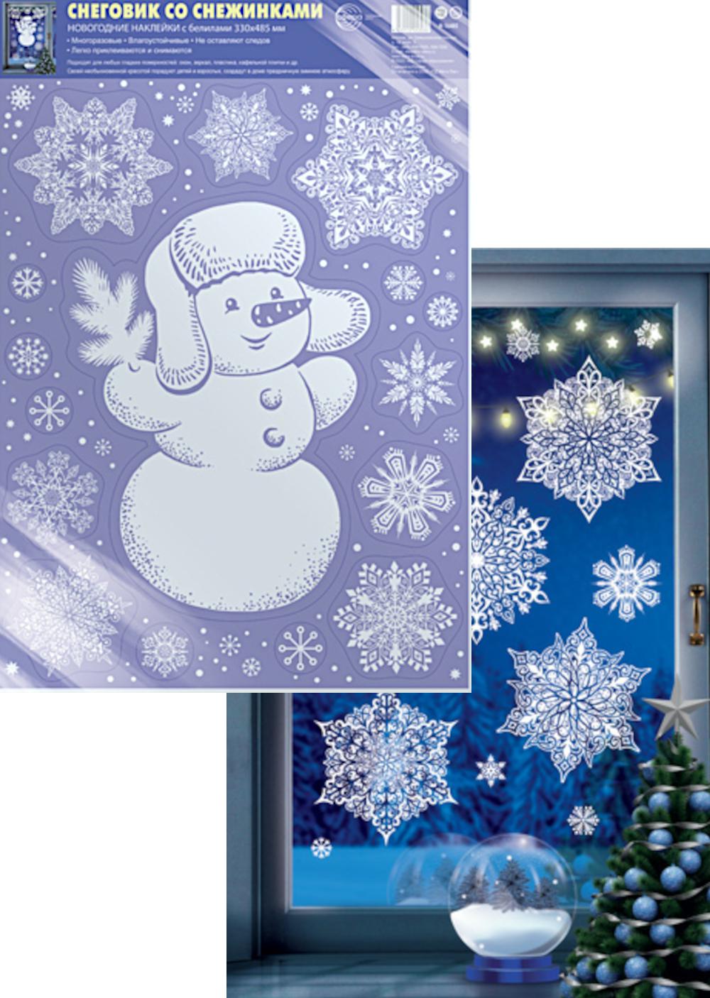 — Н-16485 Новогодние наклейки А3+. Снеговик со снежинками (белила, многоразовые, видны с обеих сторон)