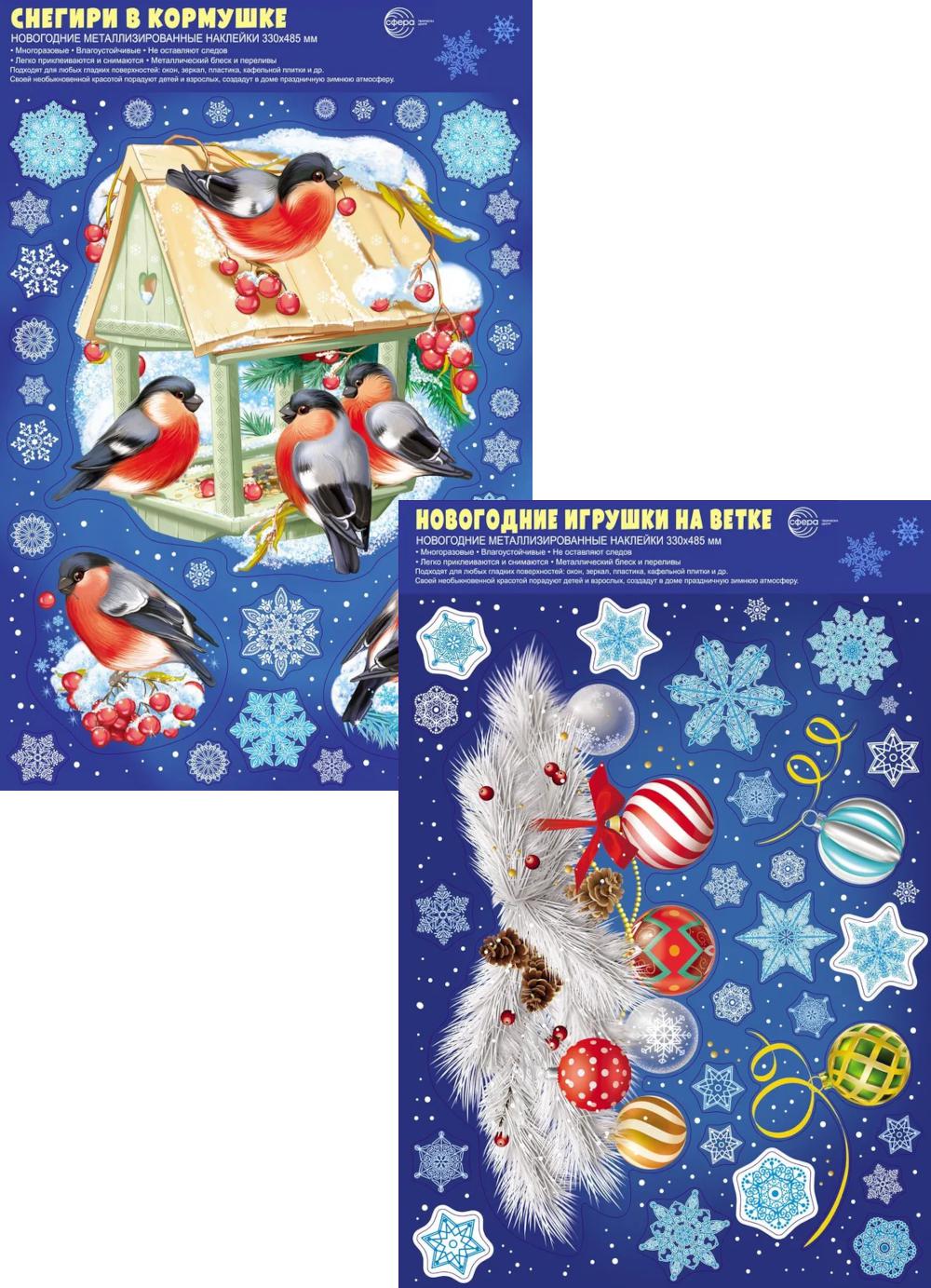 *КБН-17193 Комплект новогодних наклеек А3. Снегири с еловой веткой (2 наклейки, серебряная металлизация, многоразовые)