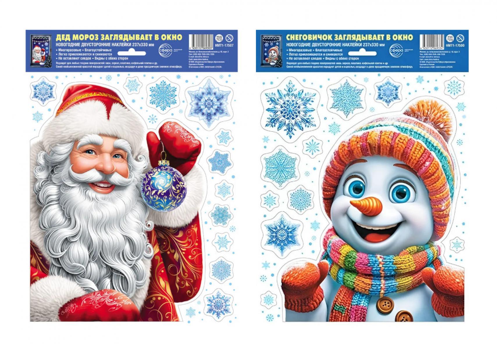 *КБН-17762 Комплект новогодних наклеек А4+. Дед Мороз и Снеговик заглядывают в гости-2 (2 наклейки, видны с обеих сторон, многоразовые)