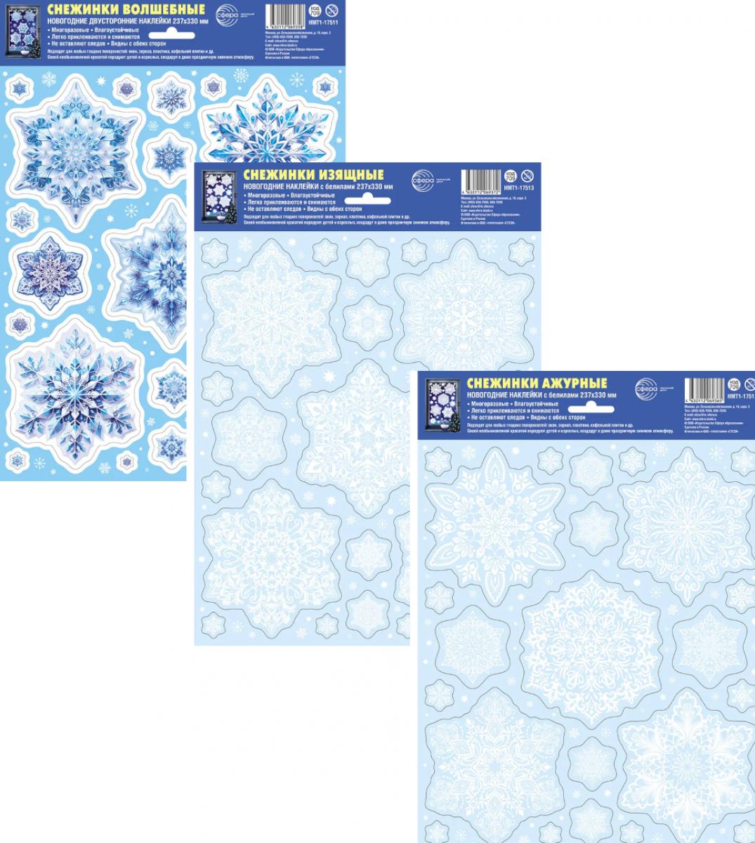 *КБН-17763 Комплект новогодних наклеек А4+. Снежинки разные (3 наклейки, белила, видны с обеих сторон, многоразовые)