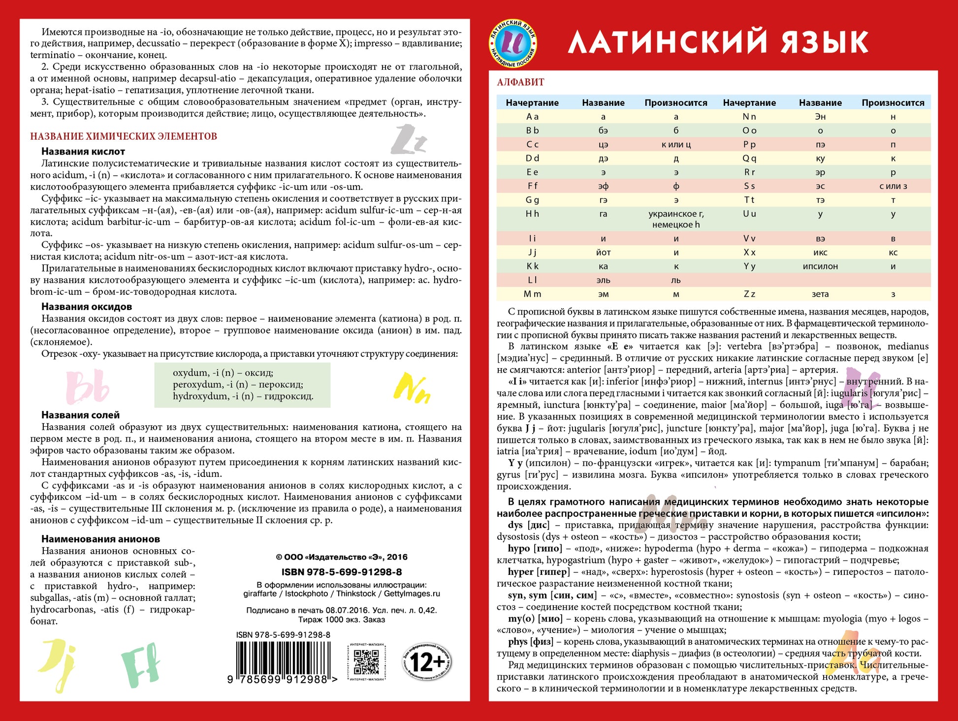 Удобные компактные наглядные пособия-шпаргалки с защитной пленкой. Компактный размер под стандартные файлы. Все самые необходимые данные для изучения латинского языка, необходимые студентам медицинских и гуманитарных ВУЗов.