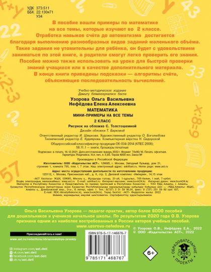 В пособие вошли примеры по математике на все темы, которые изучают во 2 классе.Для каждой темы даны четыре блока заданий по три различных мини-задания в каждом. Отработка навыков счёта до автоматизма достигается благодаря выполнению разнообразных видов заданий. В конце книги приведены подсказки – алгоритмы счёта, объясняющие последовательность вычислений.Маленький объем заданий не утомителен для ребёнка, и он будет с удовольствием заниматься по этой книге, а родители смогут легко проверить его знания. Такие задания также удобно использовать на уроке для мини-контрольной или в качестве дополнительного материала.Книга пригодится на уроках математики, для работы дома с родителями и станет незаменимым помощником для репетиторов.