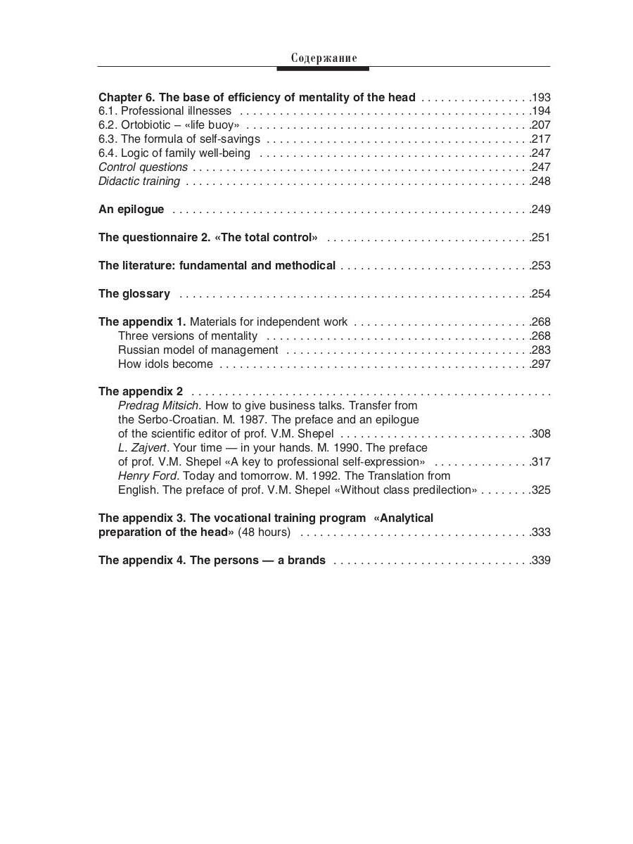 Автор: Шепель В., «Менталитет руководителя. Управленческое мышление. 2-е изд., стер»: Книга — учебное пособие, предназначенное для деловых людей, менеджеров, преподавателей и студентов вузов слушателей системы последипломного образования и повышения профессиональной квалификации, для руководителей государственных, региональных и местных органов управления. Она полезна лидерам общественных организаций и политических партий. Знание менталитета как механизма мыслительной деятельности, овладение управленческим мышлением полезно каждому, кто заинтересован в личностном преуспевании, в профессиональном возвышении, в достижении экономического благополучия.