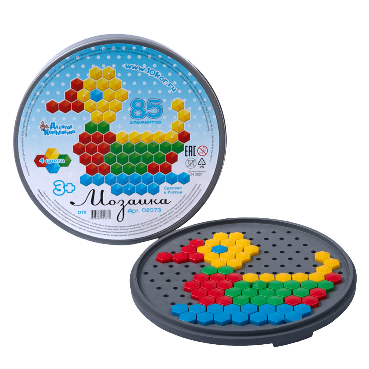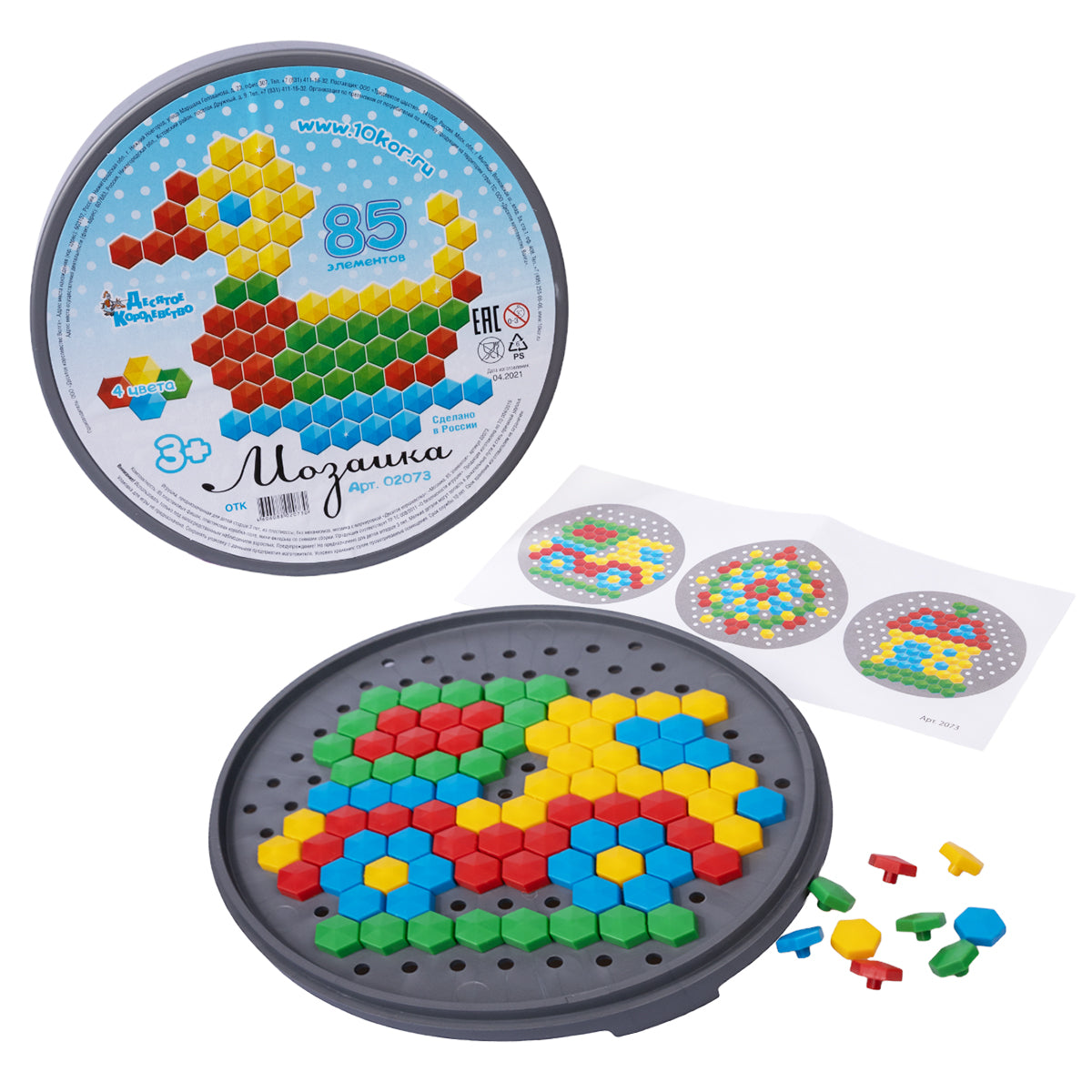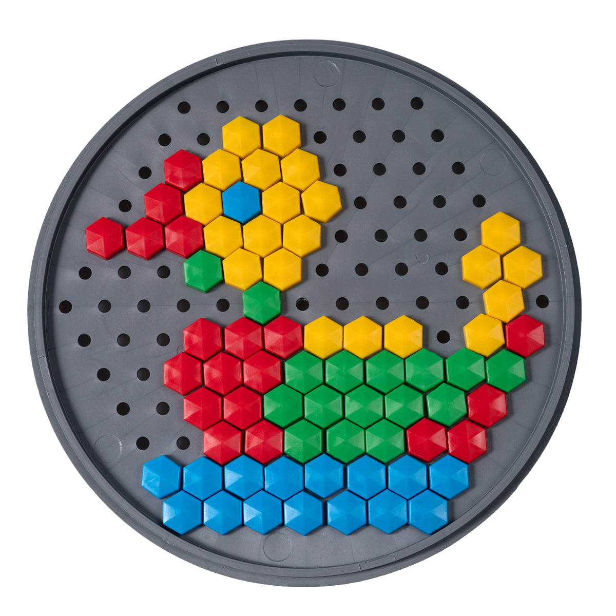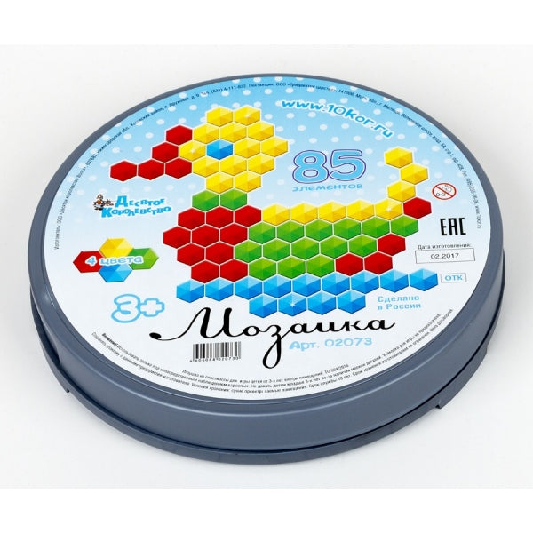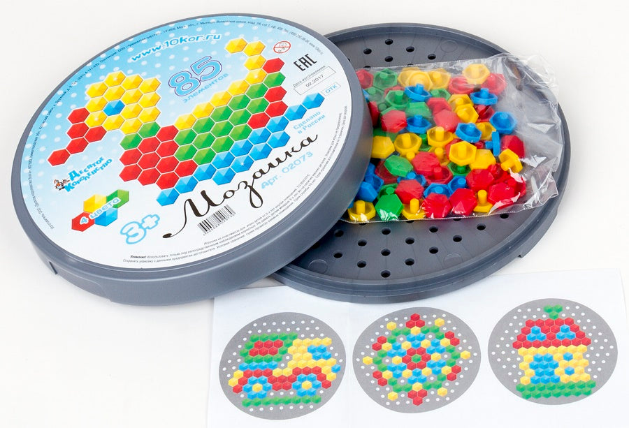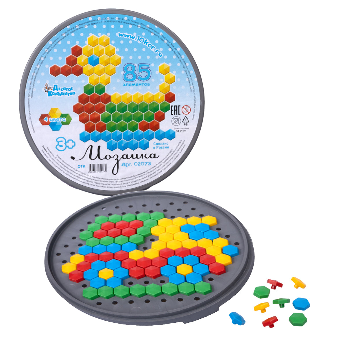 Handling time: 24 days Мозаика пластмассовая детская шестигранная 85 элементов:- 4 цвета (красный, желтый, зеленый, синий);- игровое поле круглое, диаметром 20 см;- размер шестигранной мозаики 14 мм;- мини-вкладыш с шестью схемами сборки.