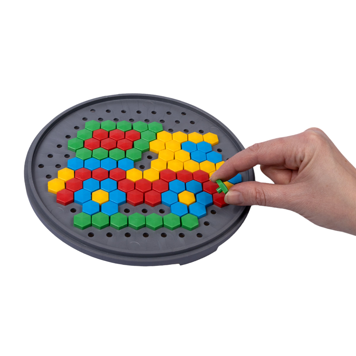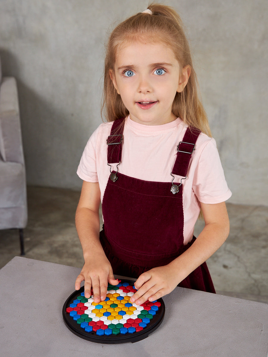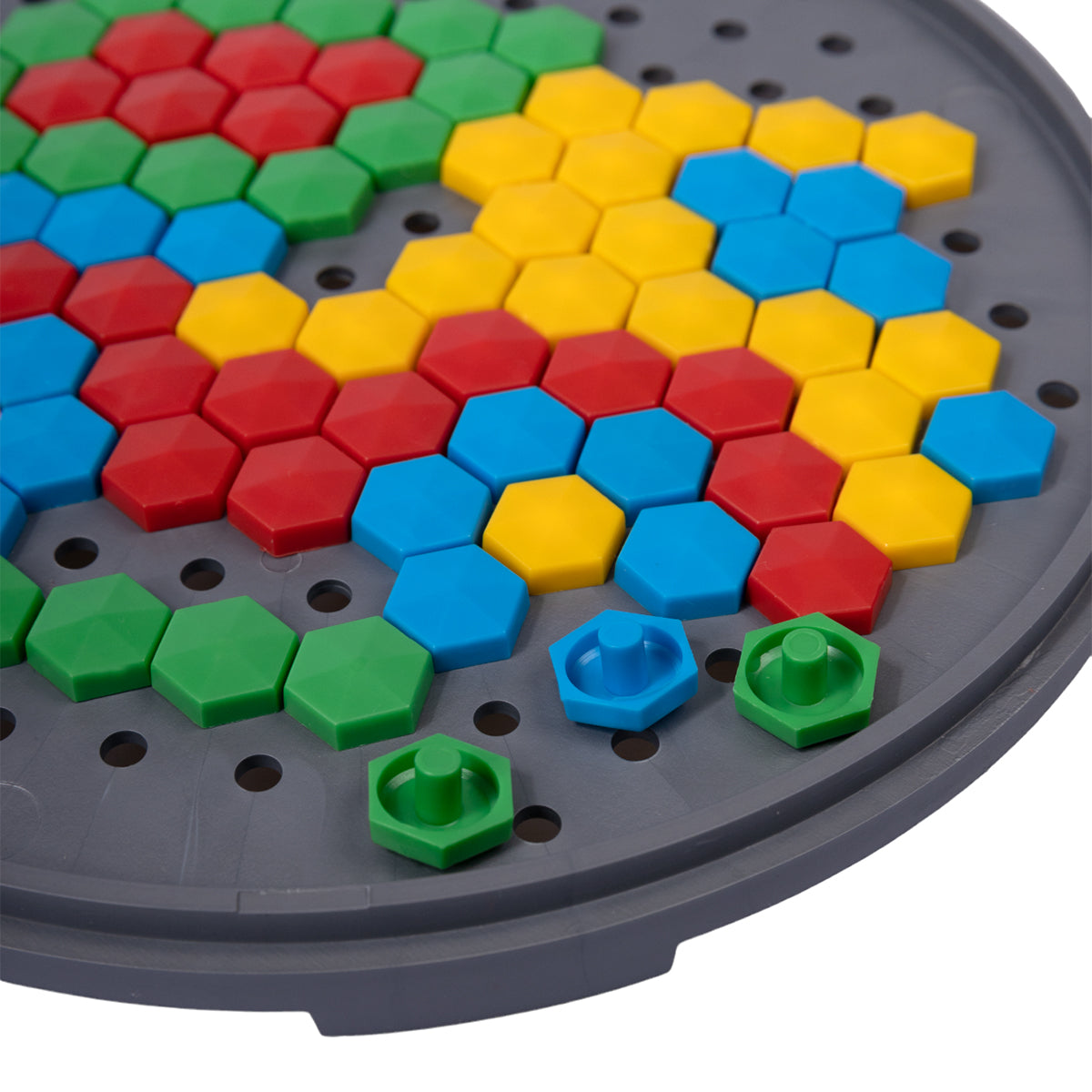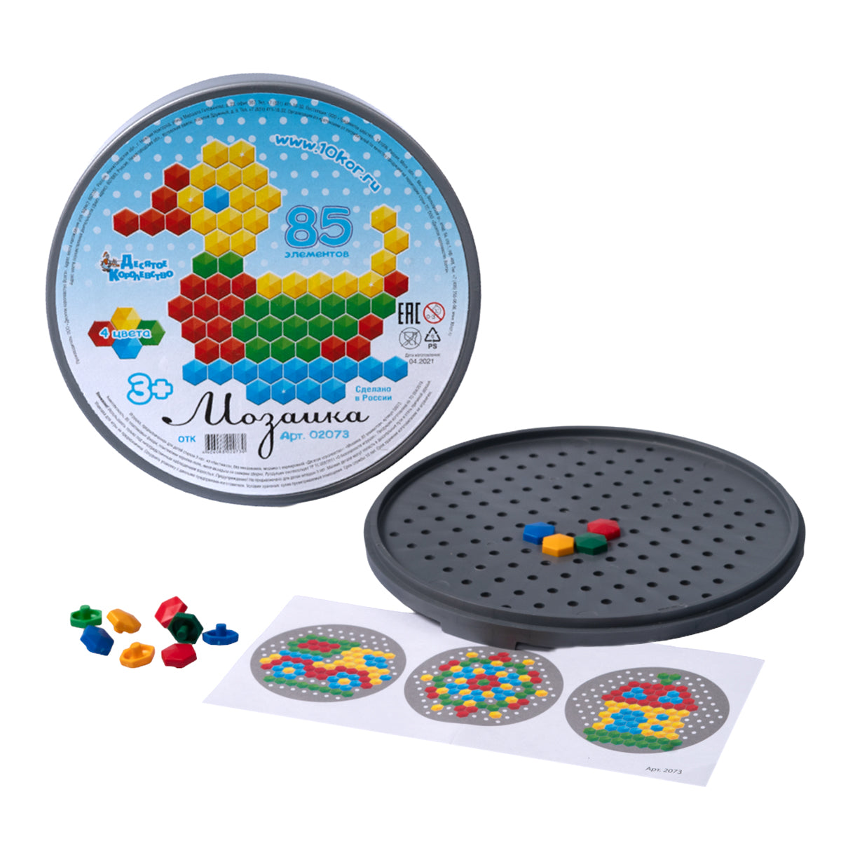 Handling time: 24 days Мозаика пластмассовая детская шестигранная 85 элементов:- 4 цвета (красный, желтый, зеленый, синий);- игровое поле круглое, диаметром 20 см;- размер шестигранной мозаики 14 мм;- мини-вкладыш с шестью схемами сборки.