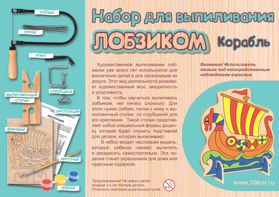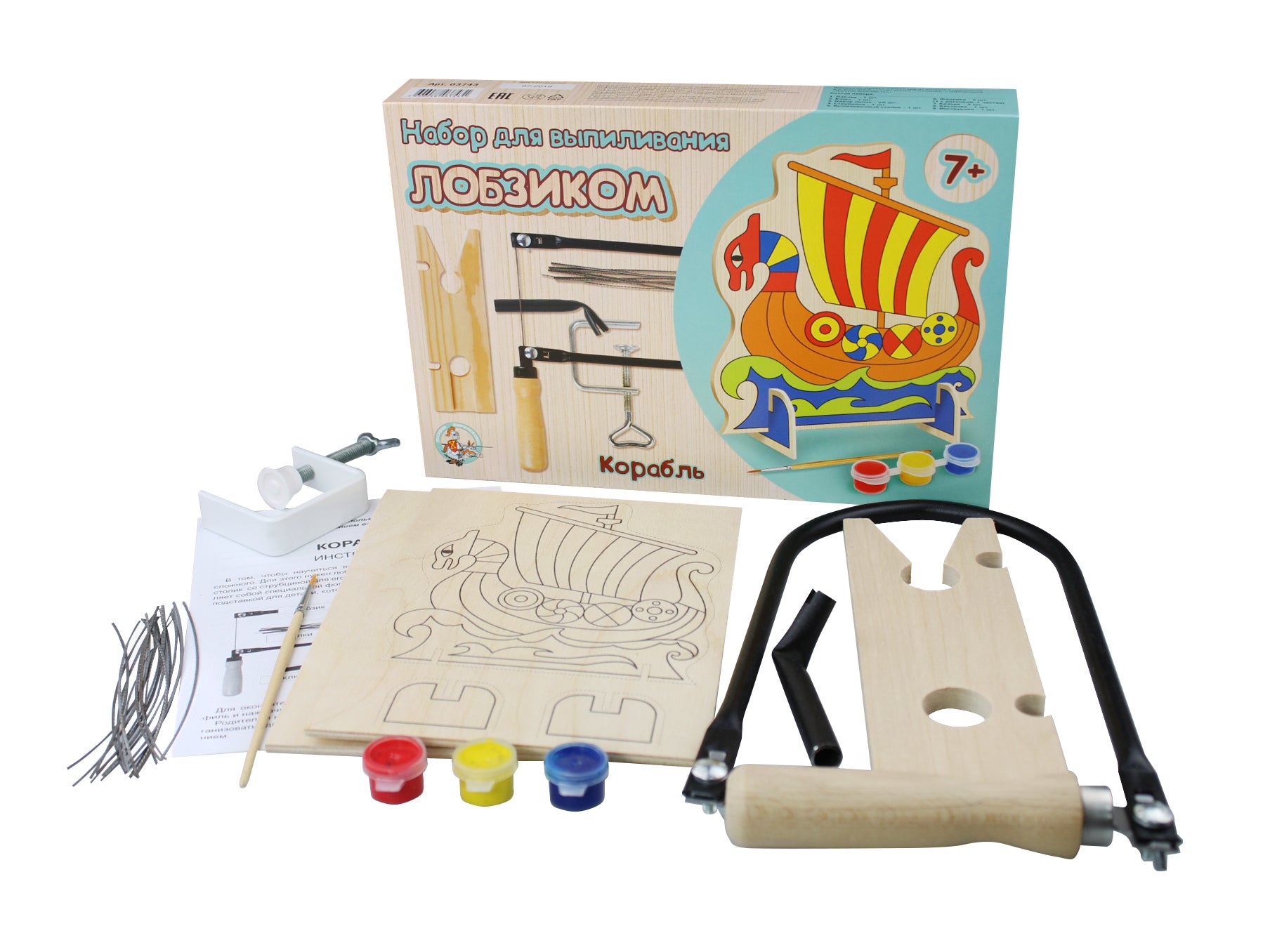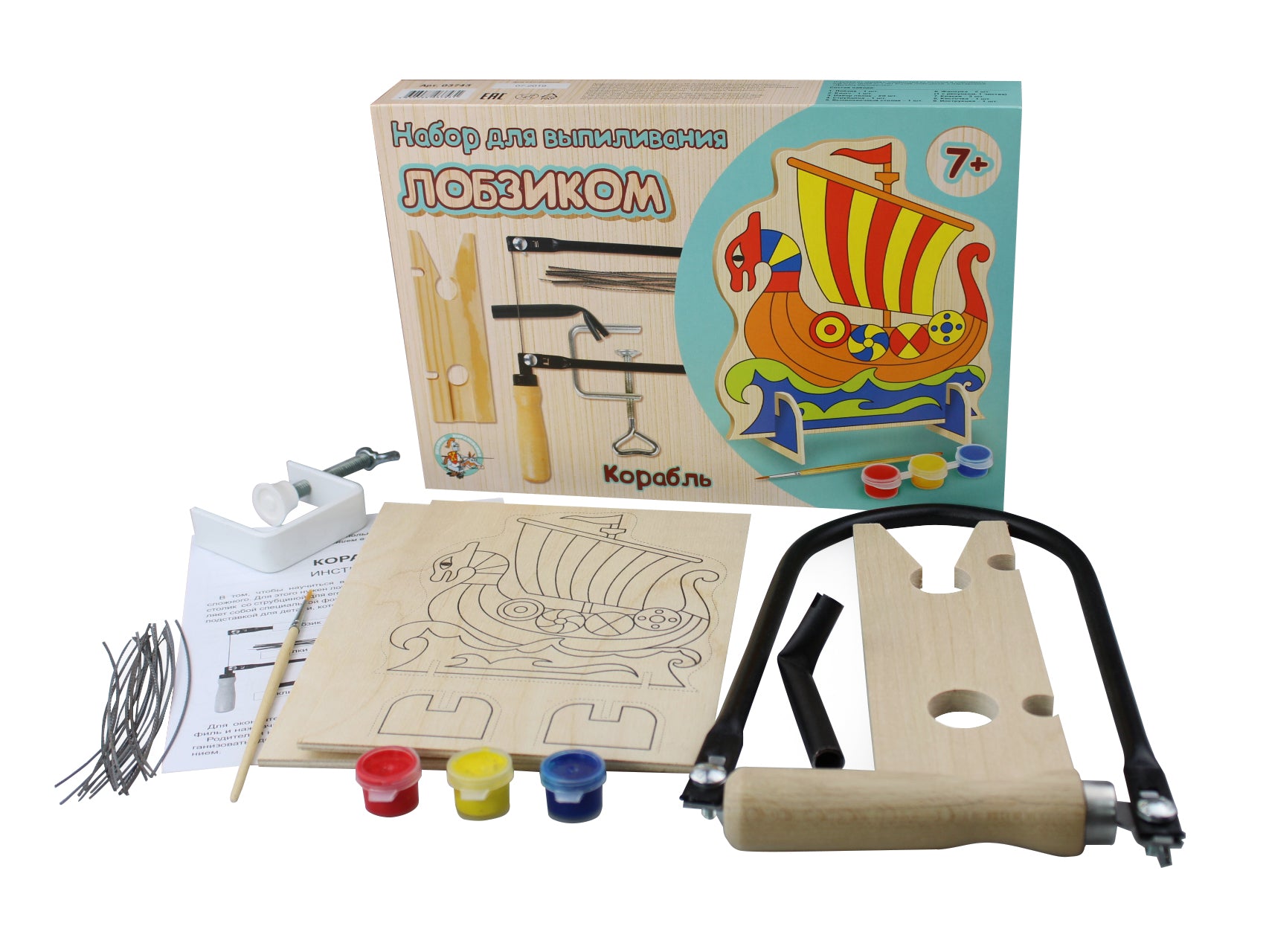 Handling time: 24 days Откройте новый вид досуга для своего ребёнка – художественное выпиливание лобзиком.Состав набора:• лобзик – 1 шт.• ключ – 1 шт.• набор пилок – 30 шт.• струбцина – 1 шт.• выпиловочный столик – 1 шт.• фанерка – 2 шт. (1 с рисунком, 1 чистая; размер доски – 21х15 см.)• краски – 3 шт.• кисточка – 1 шт.• инструкцияВыпиливание лобзиком развивает у ребенка художественный вкус, аккуратность и усидчивость. В набор входит несложная модель корабля, которую ребёнок сможет выпилить самостоятельно, и подробная инструкция.Перед тем, как начать выпиливать модель корабля, потренируйтесь на чистой доске. Для этого карандашом нарисуйте линии и геометрические фигуры на дощечке, а затем попросите ребёнка выпилить их.После окончания работы над моделью рекомендуется произвести окончательную отделку надфилем или наждачной бумагой (не входят в набор), а затем раскрасить.Внимание! Присутствие взрослого при использовании набора обязательно! Набор содержит острые детали.Набор предназначен для детей от 7 лет.Посмотрите другие наборы для выпиливания лобзиком от «Десятого королевства» на нашем сайте .