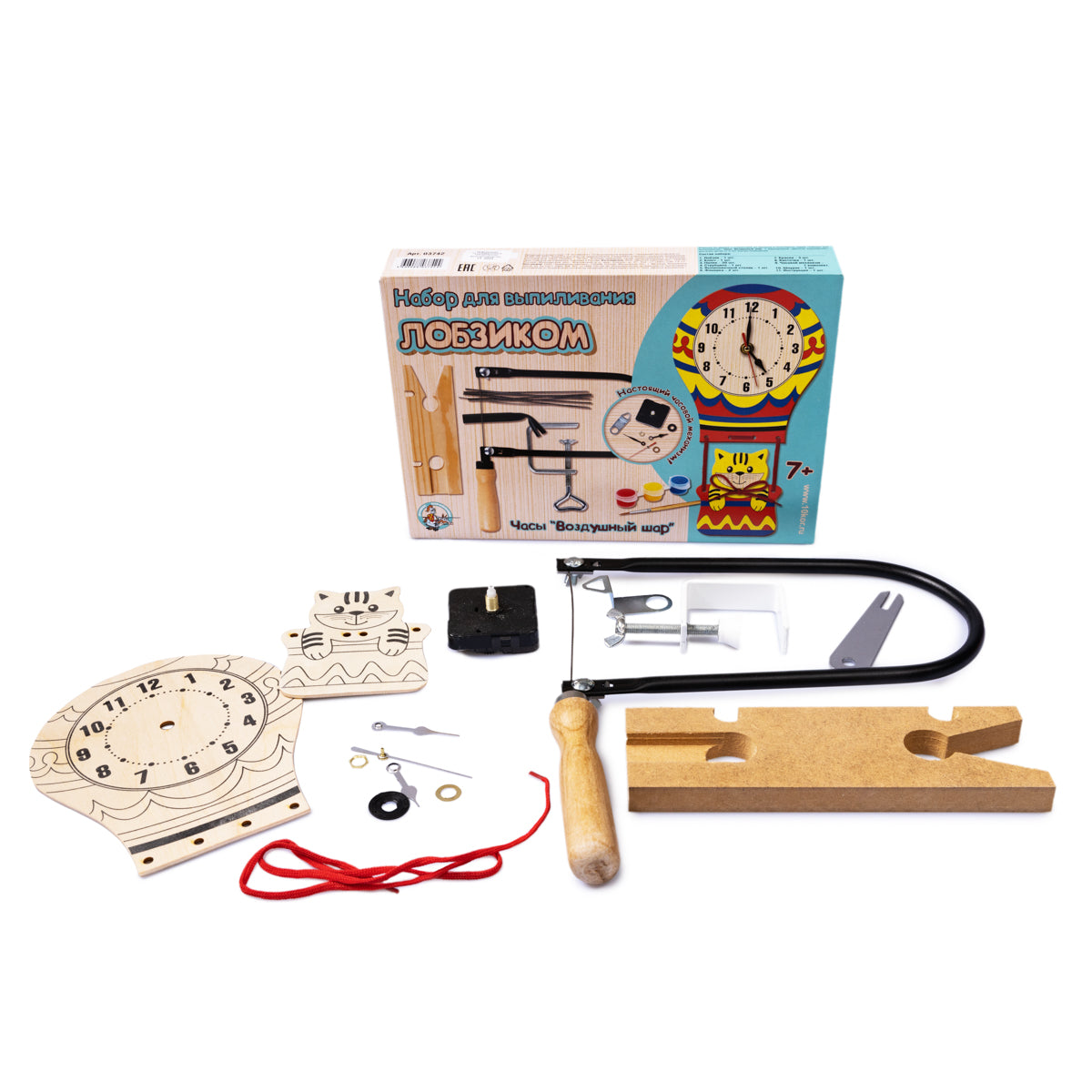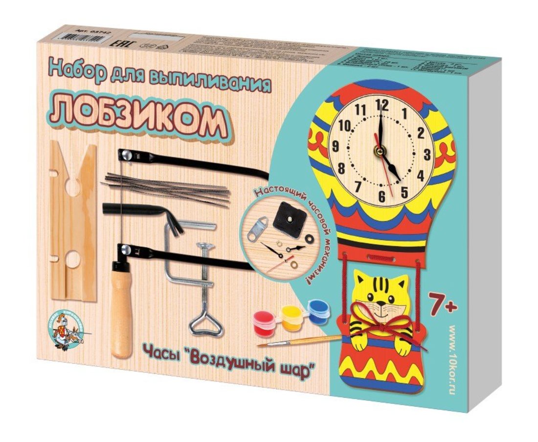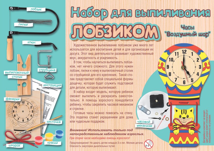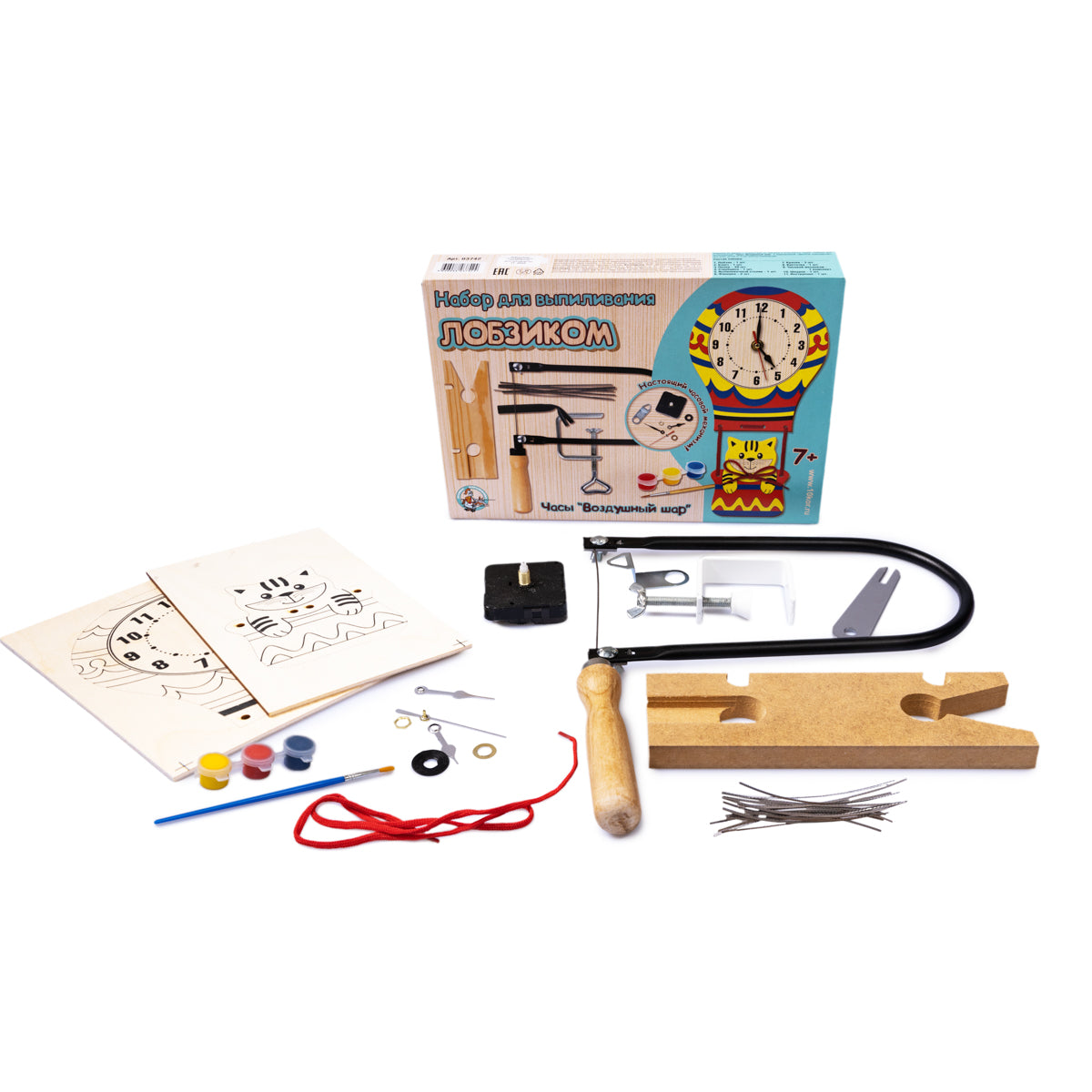 Handling time: 14 days Откройте новый вид досуга для своего ребёнка – художественное выпиливание лобзиком.Состав набора:• лобзик – 1 шт.• ключ – 1 шт.• набор пилок – 30 шт.• струбцина – 1 шт.• выпиловочный столик – 1 шт.• фанерка – 2 шт. (1 с рисунком, 1 чистая; размер доски – 21х15 см.)• краски – 3 шт.• кисточка – 1 шт.• часовой механизм – 1 комплект• шнурок – 1 шт.• инструкцияВыпиливание лобзиком развивает у ребенка художественный вкус, аккуратность и усидчивость. В набор входит несложная модель часов в форме воздушного шара, которую ребёнок сможет выпилить самостоятельно, и подробная инструкция.Перед тем, как начать выпиливать модель, потренируйтесь на чистой доске. Для этого карандашом нарисуйте линии и геометрические фигуры на дощечке, а затем попросите ребёнка выпилить их.После окончания работы над моделью рекомендуется произвести окончательную отделку надфилем или наждачной бумагой (не входят в набор). Раскрасьте детали и соедините модель с часовым механизмом – и часы своими руками готовы!Внимание! Присутствие взрослого при использовании набора обязательно! Набор содержит острые детали.Набор предназначен для детей от 7 лет.Посмотрите другие наборы для выпиливания лобзиком от «Десятого королевства» на нашем сайте .