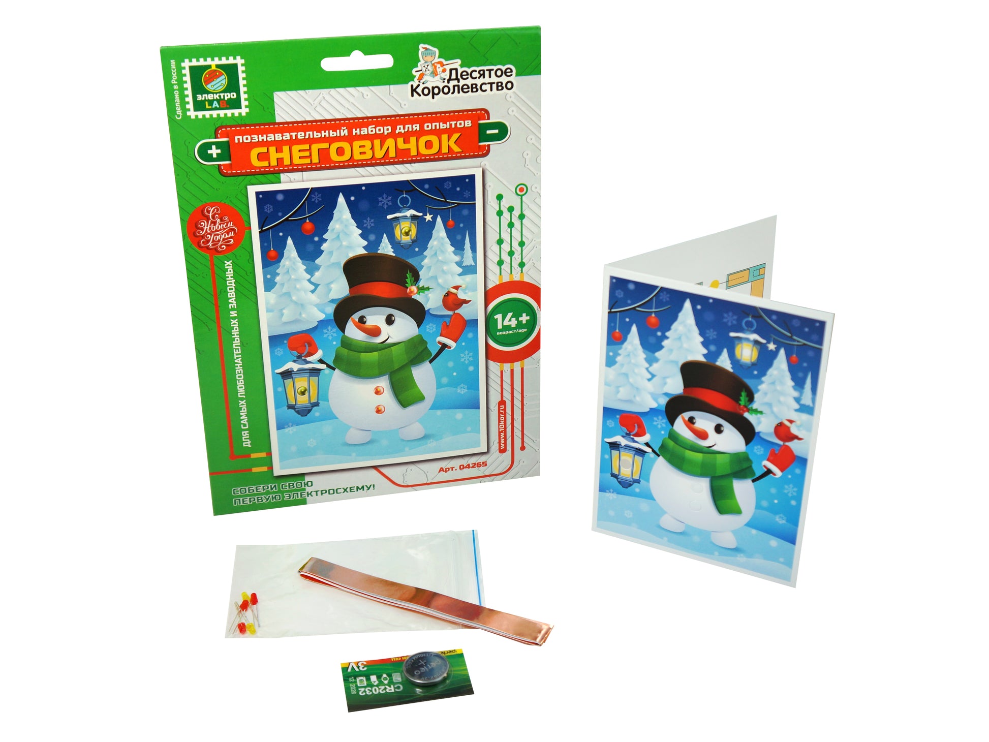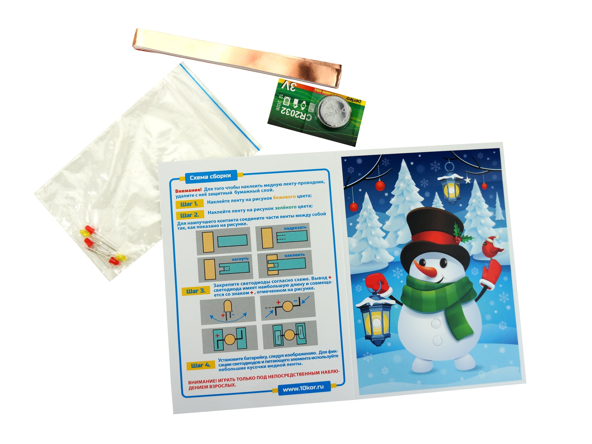 Handling time: 14 days Набор для сборки первой электросхемы «Снеговичок». Состав набора: картонная открытка – 1 шт. (14,8 х 10,5 см), светоиды – 5 шт. (2 жёлтого цвета, 3 красного цвета), токопроводящая медная самоклеящаяся лента – 1 шт. (100 х 1 см), питающий элемент 3V (батарейка CR2032) – 1 шт. Материалы: картон, бумага, пластмасса, металл. Внимание! Набор для опытов предназначен для детей старше 14 лет. Играть с набором необходимо под непосредственным наблюдением взрослых! Набор для творчества «Снеговичок» поможет получить первый опыт в работе с простыми электросхемами, понять принцип работы электричества и сформировать интерес к естественным наукам. В процессе сборки электросхемы развиваются такие навыки, как аккуратность, внимательность, умение следовать инструкциям.