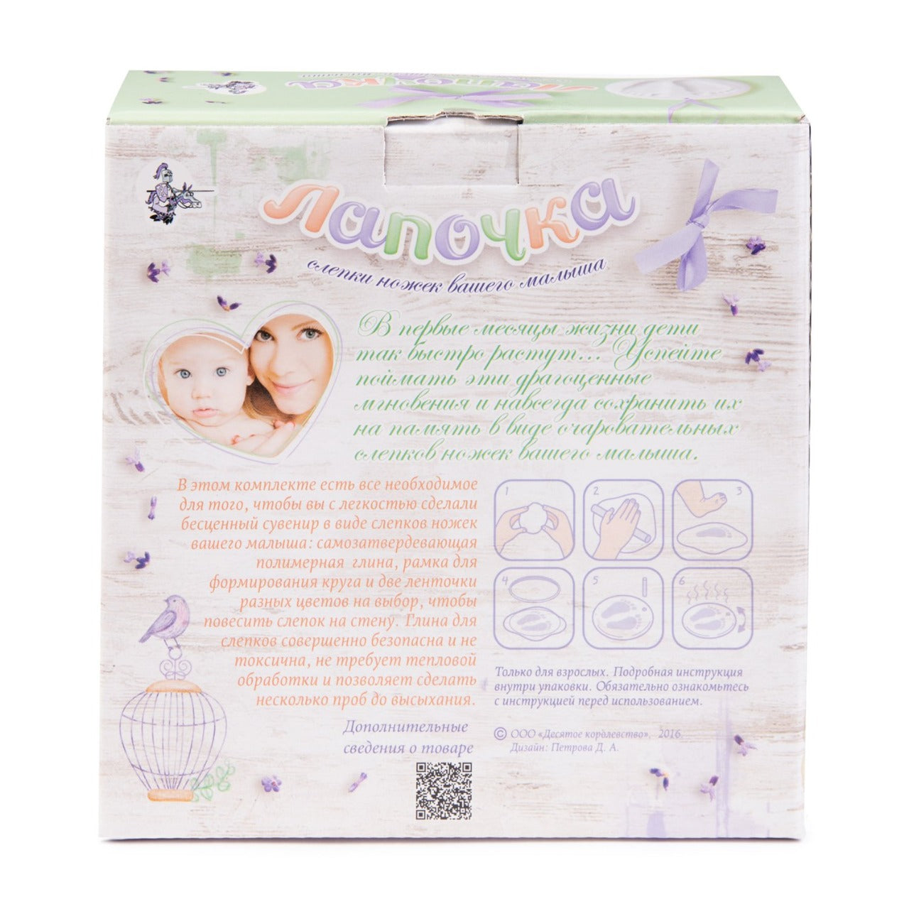 Handling time: 24 days Отличный подарок родителям на рождение малыша!Оговоримся сразу, набор для изготовления слепков ручек и ножек не является детской игрушкой, он предназначен только для взрослых.Первые месяцы жизни наши любимые малютки растут очень быстро, поэтому счастливые родители хотят увековечить эти драгоценные мгновения жизни своей крохи, оставить след очаровательных слепков ручек или ножек в истории, пусть даже семейной.В комплекте набора для изготовления слепков ручек и ножек «Лапочка» есть все необходимое для того, чтобы без сложных манипуляций сделать бесценный сувенир на память:- самозатвердевающая полимерная глина является основой набора;- рамка для формирования круга;- две цветных ленточки на выбор, чтобы повесить драгоценный слепок на стену;- приспособления для раскатки полимерной глины и пробивки отверстия в слепке;- подробная инструкция по работе с набором.Глина для слепков совершенно безопасна, не токсична, не требует тепловой обработки и позволяет сделать несколько проб до высыхания. Тем не менее, при получении слепков ножек, настоятельно рекомендуем соблюдать несколько простых правил:- держать подальше от малыша мелкие предметы;- не позволяйте ребенку играть с глиной, брать в рот, тереть глаза;- до и после создания отпечатков помойте ножки и ручки ребенка.«Десятое королевство» не единственный производитель наборов для «увековечивания» отпечатков ножек и ручек малыша, но, пожалуй, первый, кто предложил «разумную» цену при добротном качестве.