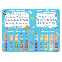 Настольное покрытие для лепки прямоугольной формы с закругленными углами размером 43х32 см.На лицевой стороне изображён русский и английский алфавит, таблица умножения. Яркая, красочная информация увлекает и развивает ребенка. Плотное покрытие коврика защищает поверхность стола от загрязнений и повреждений. Создает удобство при письме. Покрытие коврика адаптировано к компьютерной мышке.Материал: пластик (полипропилен).