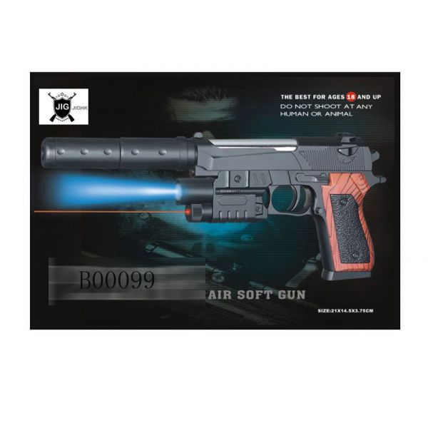 ПИСТОЛЕТ (П) С ЛАЗЕР. ПРИЦЕЛОМ, С ФОНАРЕМ, ГЛУШИТЕЛЕМ, С ПУЛЬКАМИ P2117-F В КОР 21*14*4СМ в кор120шт