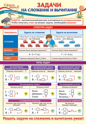 Плакат рекомендован для занятий по математике с учащимися 3-х классов общеобразовательных организаций. Соответствуют ФГОС начального общего образования по учебному предмету «Математика». Плакат даст представление о понятии «математическая задача», ее структуре (условие, вопрос, решение, ответ), познакомит с решением задач на нахождение суммы, неизвестного слагаемого, увеличение и уменьшение числа, сравнение и нахождение остатка. Для удобства каждый текстовой блок проиллюстрирован примерами и выделен соответствующим цветом. Плакат имеет удобный формат А3, его легко разместить в классной комнате, также с нимудобно изучать тему в домашних условиях.