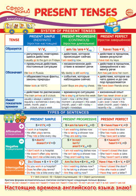 Present Tenses (Настоящие времена)Плакат рекомендован для занятий по английскому языку с учащимися 3-х классов общеобразовательных организаций. Соответствует ФГОС начального общего образования по учебному предмету «Английский язык».Плакат посвящен такой грамматической категории английского языка, как настоящее время. В виде таблицы представлена система основных типов настоящих времен: Present Simple (Present Indefinite), Present Progressive (Continious), Present Perfect. В ней рассматриваются принцип образования настоящего времени, случаи употребления, показатели времени, приводятся примеры использования в речи. Для каждого времени дается схема построения разных типов предложения: утвердительного, отрицательного, вопросительного.Плакат яркий, привлекающий к себе внимание ребёнка. Имеет удобный формат А3, его легко разместить в классе или дома для изучения предложенного материала.