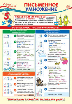 Плакат рекомендован для занятий по математике с учащимися 4-х классов общеобразовательных организаций. Соответствуют ФГОС начального общего образования по учебному предмету «Математика». Плакат даст представление о понятии «письменное умножение», познакомит с основными приемами умножения двузначного числа на двузначное, трехзначного на однозначное, а также многозначных чисел, оканчивающихся нулями, поможет выработать и закрепить навыки математических действий. Для удобства каждый текстовой блок проиллюстрирован примерами и выделен соответствующим цветом. Плакат имеет удобный формат А3, его легко разместить в классной комнате, также с ним удобно изучать тему в домашних условиях.
