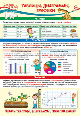 Плакат даст представление о таблицах, диаграммах и графиках, поможет их «расшифровывать» и составлять на основании имеющихся данных, также учащиеся познакомятся с новой терминологией, необходимой для данной работы. Для удобства каждый текстовой блок проиллюстрирован примерами и выделен соответствующим цветом.