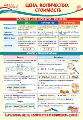 Плакат даст представление о понятиях «цена», «количество», «стоимость», алгоритмах их вычисления, познакомит с основными формулами, поможет выработать и закрепить навыки необходимых математических действий. Для удобства каждый текстовой блок проиллюстрирован примерами и выделен соответствующим цветом.
