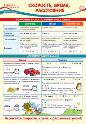 Плакат даст представление о понятиях «скорость», «время», «расстояние», алгоритмах их вычисления, познакомит с основными формулами, поможет выработать и закрепить навыки необходимых математических действий. Для удобства каждый текстовой блок проиллюстрирован примерами и выделен соответствующим цветом.