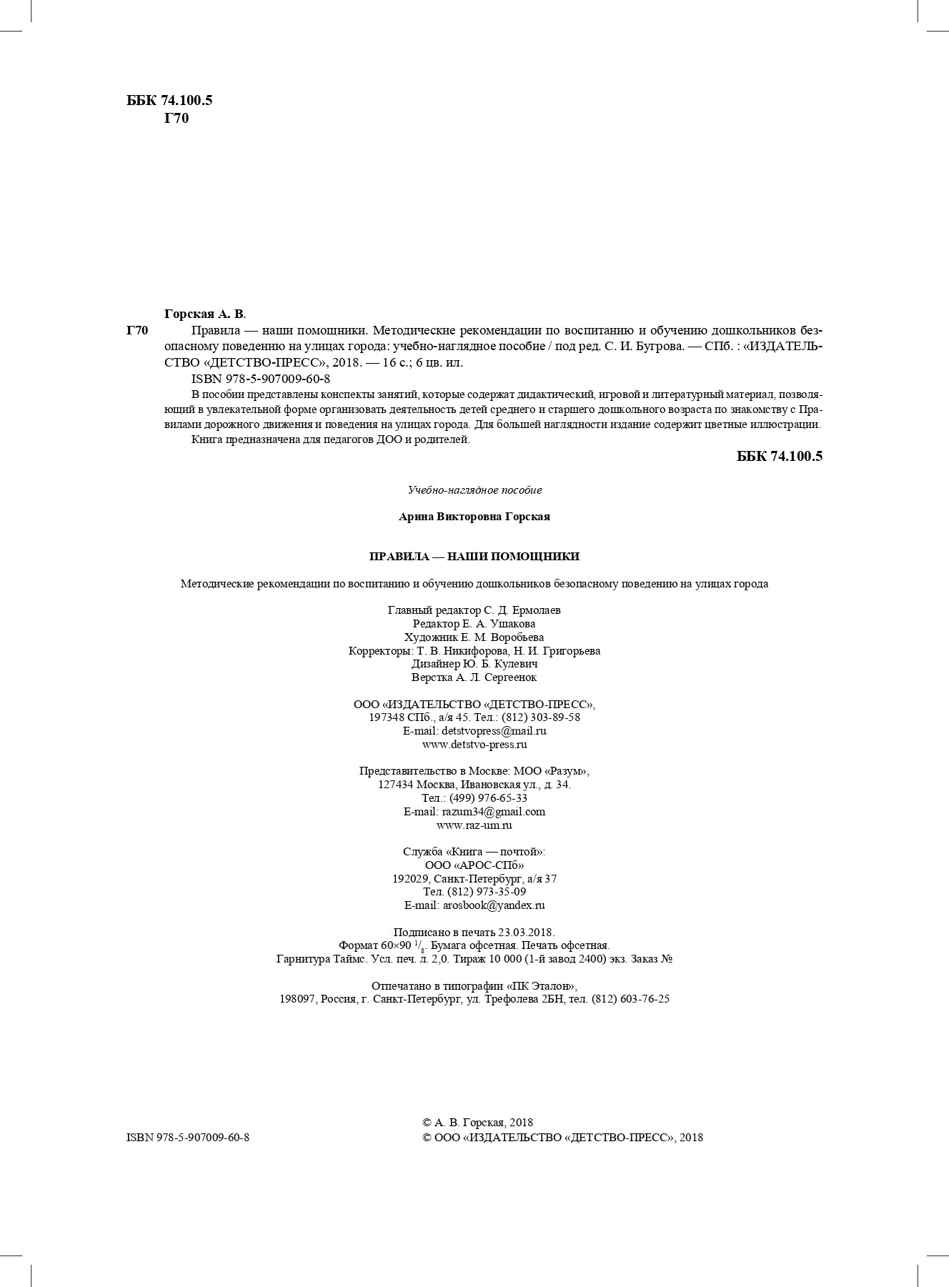 Handling time: 19 days Правила - наши помощники. Методические рекомендации по воспитанию и обучению дошкольников безопасному поведению на улицах города: учебно-наглядное пособие. Горская А.В. В пособии представлены конспекты занятий, которые содержат дидактический, игровой и литературный материал, позволяющий в увлекательной форме организовать деятельность детей среднего и старшего дошкольного возраста по знакомству с Правилами дорожного движения и поведения на улицах города. Для большей наглядности издание содержит цветные иллюстрации. Книга предназначена для педагогов...