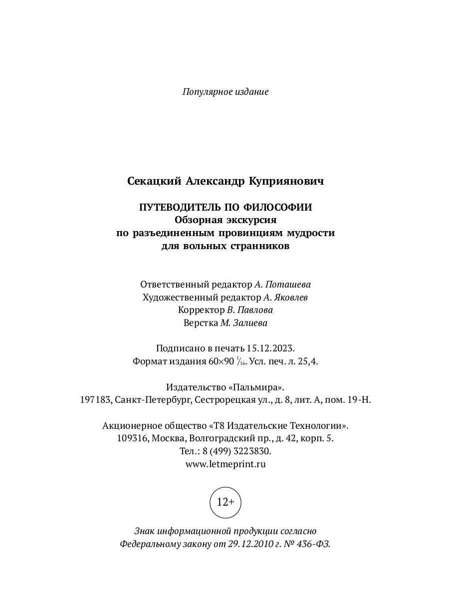 Автор: Секацкий А.К., «Путеводитель по философии. Обзорная экскурсия по разъединенным провинциям мудрости для вольных странников»: «Путеводитель по философии» Александра Секацкого предназначен для вольных странников, намеревающихся совершить «обзорную экскурсию по разъединенным провинциям» философии «налегке, не обременяя себя багажом специальных знаний, не поддаваясь гипнотической позе мудрости и не жмурясь от света истины». Но для того чтобы стать в философском мире желанным гостем, необходимо научиться притворяться знатоком. В этой книге путешественник найдет техники искусной имитации - необходимые отмычки для беспрепятственного проникновения в любую из философских провинций.