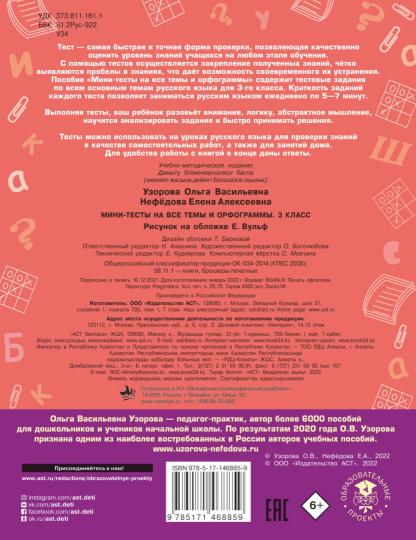 Тест - самая быстрая и точная форма проверки, позволяющая качественно оценить уровень знаний учащихся на любом этапе обучения. С помощью тестов осуществляется закрепление полученных знаний, чётко выявляются пробелы в знаниях, что даёт возможность своевременного их устранения.Пособие "Мини-тесты на все темы и орфограммы" содержит тестовые задания по всем основным темам русского языка для 3го класса. Краткость заданий каждого теста позволяет заниматься русским языком ежедневно по 5-7 минут.Выполняя тесты, ваш ребёнок разовьёт внимание, логику, абстрактное мышление, научится анализировать задания и быстро принимать решения.Тесты можно использовать на уроках русского языка для проверки знаний в качестве самостоятельных работ, а также для занятий дома.Для удобства работы в книге даны ответы на все тесты.