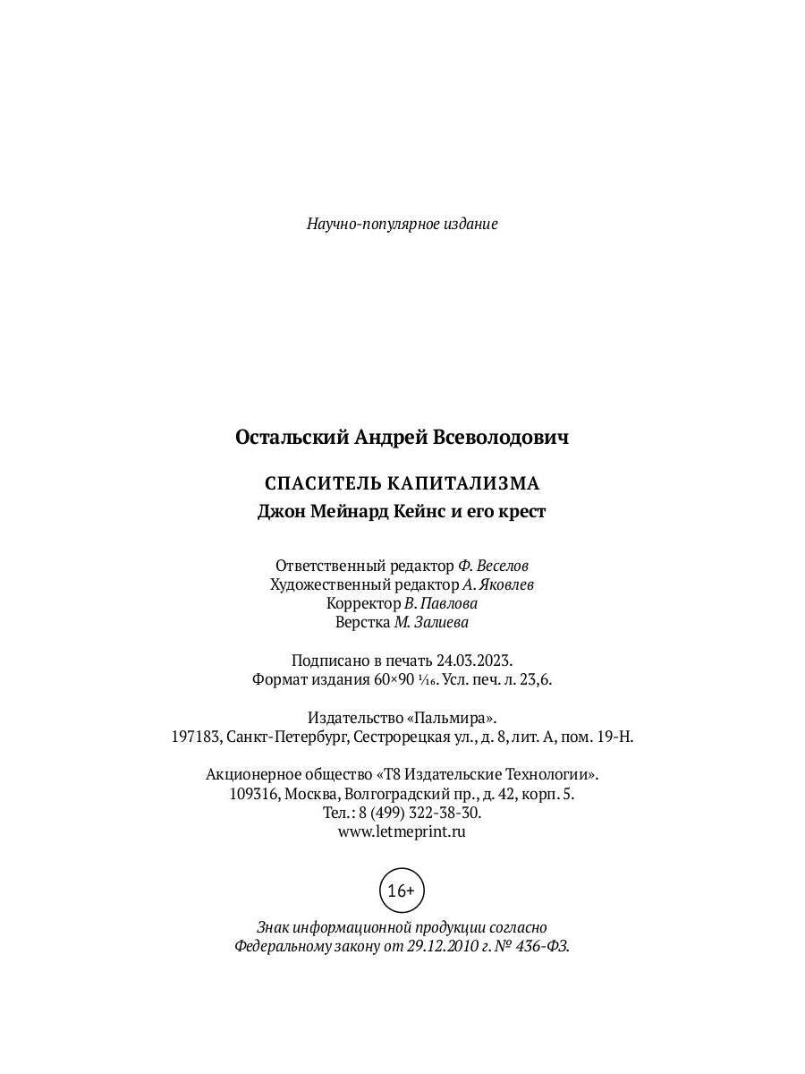 Handling time: 25 days Автор: Остальский А.В., «Спаситель Капитализма. Джон Мейнард Кейнс и его крест»: Андрей Остальский (р. 1953) - журналист, писатель, главный редактор Русской службы BBC (2000–2009), сотрудничал с изданиями Известия и The Financial Times, работал корреспондентом в Ираке, Йемене и Ливане. Остальский родился и вырос в Москве, но уже более 25 лет живет в Лондоне. Автор множества научно-популярных и художественных книг о путешествиях, истории и политике. Лауреат премии "Просветитель". Эта книга посвящена Джону Мейнарду Кейнсу (1883–1946), одному из самых значительных экономистов XX века. Часто говорят, что Кейнс предложил великий исторический компромисс - третий путь между капитализмом и социализмом. На самом деле он считал, что смысл его жизни - спасти капитализм, защитить свободу, рынок и демократию. Современники отмечали неординарный ход мысли Кейнса, его опережающую время "общую теорию", которая по сей день находится в центре внимания не только экономистов, но и всех, кто интересуется современной ситуацией в мире.
