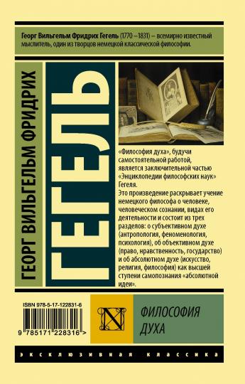 "Философия духа", будучи самостоятельной работой, является заключительной частью "Энциклопедии философских наук" Гегеля.Это произведение раскрывает учение немецкого философа о человеке, человеческом сознании, видах его деятельности и состоит из трех разделов: о субъективном духе (антропология, феноменология, психология), об объективном духе (право, нравственность, государство) и об абсолютном духе (искусство, религия, философия) как высшей ступени самопознания "абсолютной идеи".