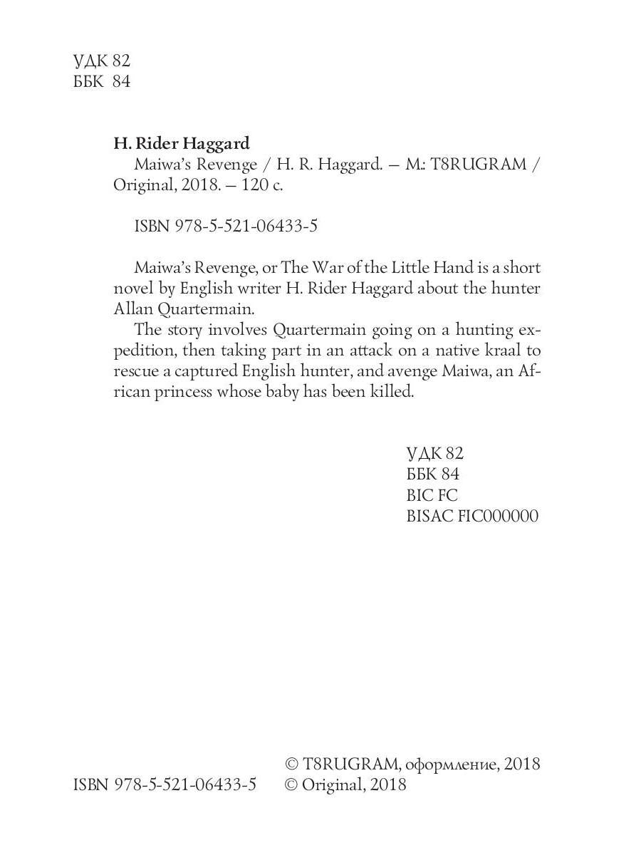 Автор: Haggard H.R., «Maiwa’s Revenge = Месть Майвы: на англ.яз»: Maiwa's Revenge, or The War of the Little Hand is a short novel by English writer H. Rider Haggard about the hunter Allan Quartermain. The story involves Quartermain going on a hunting expedition, then taking part in an attack on a native kraal to rescue a captured English hunter, and avenge Maiwa, an African princess whose baby has been killed.