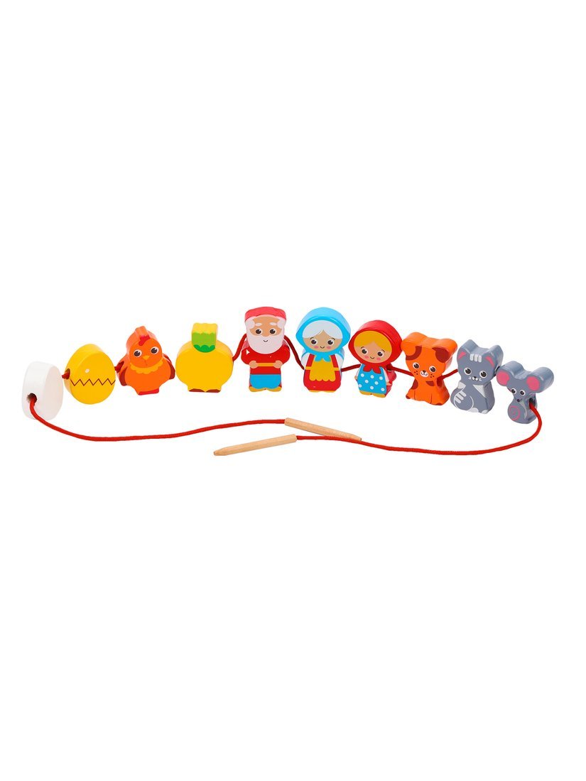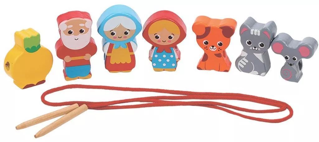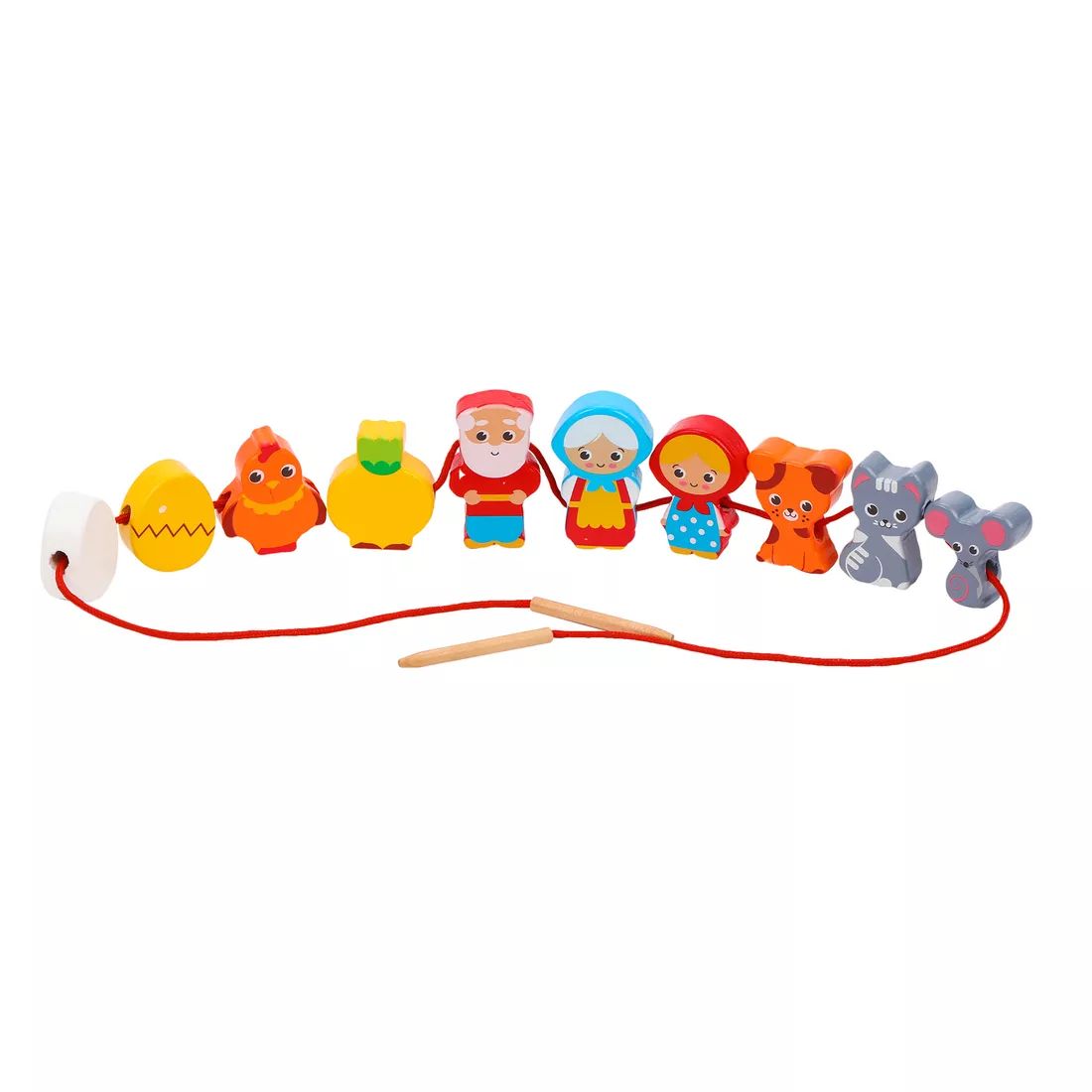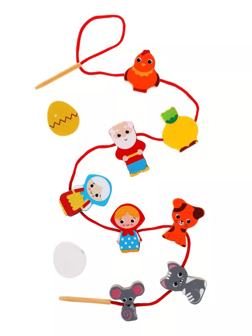 Шнуровка-сказка 2 в 1 -- это простая, но интересная игра, которая обязательно увлечёт малыша! Цель игры: нанизать на шнурок все разноцветные бусинки, выполненные в виде персонажей популярных детских сказок «Курочка Ряба» и «Репка».Ребёнку будет очень интересно менять последовательность фигурок и разыгрывать с ними небольшие спектакли!К обоим концам шнурка прикреплены удобные деревянные «иголки», с помощью которых можно легко продеть шнурок в отверстие бусины.Игра поспособствует развитию у малыша мелкой моторики рук, тактильных ощущений, способности концентрировать внимание, усидчивости и мышления.Состав игрового набора: 10 бусин высотой 3-6 см и 1 шнурок.Материал изготовления: чайное дерево.Рекомендованный возраст: 3 года +