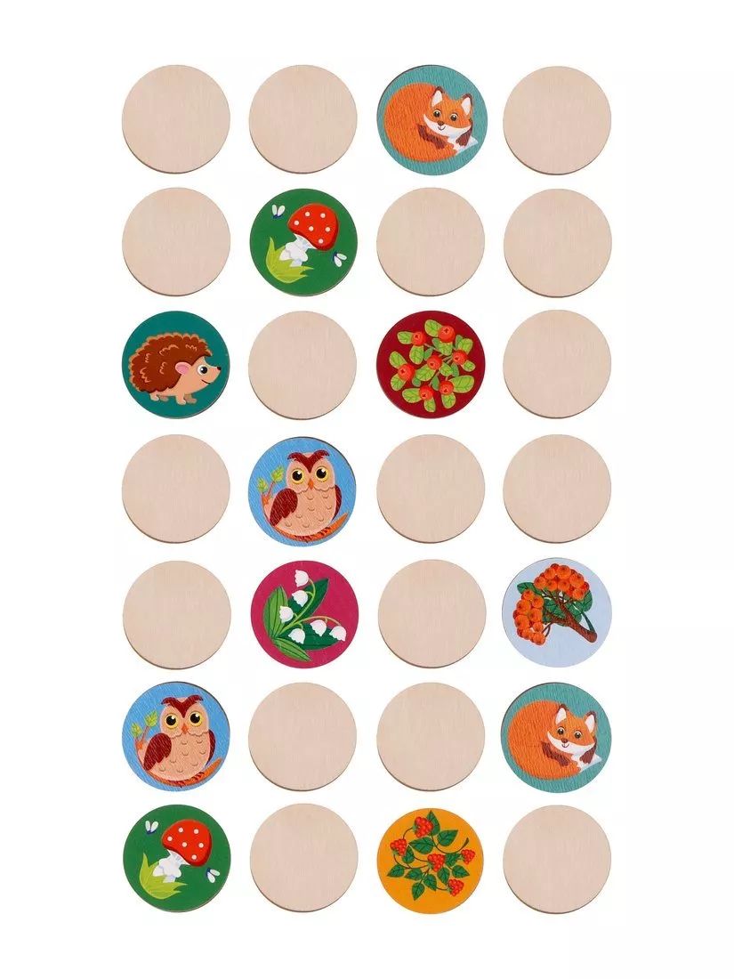 Настольная игра головоломка-мемо «Лес» способствует развитию памяти и внимания ребенка. В комплекте прилагаются 28 фишек: 7 пар с изображением животных и 7 пар с изображением растений.Количество участников: 2-6.Как играть?Перед началом игры нужно выложить фишки на стол картинками вниз и перемешать.Цель игры – найти как можно больше парных фишек с одинаковыми картинками.Игроки по очереди открывают по 2 фишки сразу. Если на фишках окажутся одинаковые картинки, то игрок забирает эти фишки себе и снова делает ход. Если картинки не совпадают, то игрок возвращает фишки на место картинкой вниз и ход переходит к следующему участнику.Побеждает тот, кто собрал в игре большее количество парных фишек.В игру ребенок может играть и самостоятельно, для тренировки памяти и внимания.Размер фишек (ДxШxВ): 4x4x0,4 см.Размер коробки (ДxШxВ):18x10,5x5,5 см.В комплекте прилагается мешочек – в нем будет удобно хранить фишки.Размер мешочка (ДxШ): 17,5x12,5 см.Изготовлено из древесных материалов (фанера), с элементами из текстильных материалов.Рекомендованный возраст: 3 года+