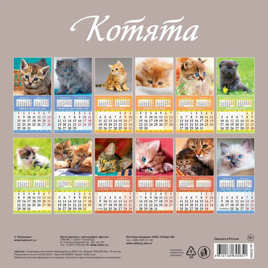 Календарь с котятами на 2024 год. Переплет на скрепке (285*285 мм) 12 листов