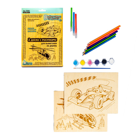 ВЫЖИГАНИЕ. ДОСКИ ДЛЯ ВЫЖИГАНИЯ 2 ШТ "ВЕРТОЛЕТ И ГОНОЧНЫЙ АВТОМОБИЛЬ" (БЛИСТЕР) в кор.45шт