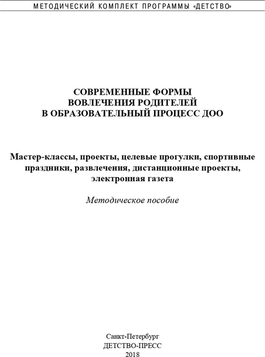 Современные формы вовлечения родителей в образовательный процесс ДОО: мастер-классы, проекты, целевые прогулки, спортивные праздники, развлечения, дистанционные проекты, электронная газета: методическое пособие. Методический комплект программы «Детство».
