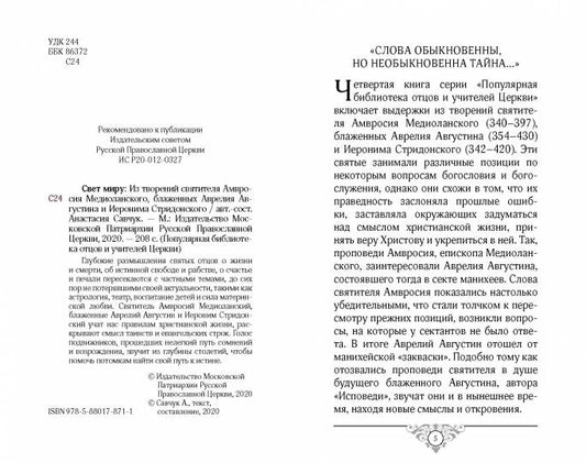 Свет миру: Из творений святителя Амвросия Медиоланского, блаженных Аврелия Августина и Иеронима Стридонского