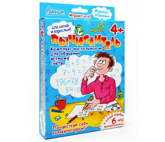 Обучающая игротека "Вычислитель" - это комплекс настольных игр, превращающих процесс обучения арифметике в весёлый и увлекательный процесс. Он будет полезен детям дошкольного и школьного возраста, а также взрослым, решившим развить навыки быстрого счёта "в уме". В наборе есть 6 разных игр, каждая из которых направлена на развитие определённых навыков - от простого к сложному. Игры способствуют формированию представления о количественном составе чисел, об их свойствах и законах, действующих между ними; изучению арифметических действий на сложение, вычитание, умножение и деление; запоминанию таблицы умножения и освоению сложных арифметических вычислений. Комплектация: правила, 68 карточек. Игры рассчитаны на 2-5 игроков. Материал изготовления: картон. Рекомендованный возраст: 4 года +