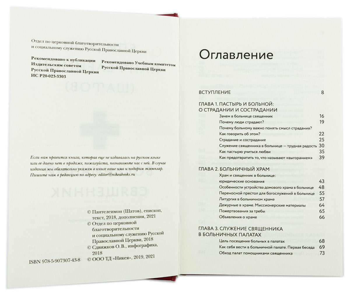 «Больничный священник» — книга епископа Пантелеимона (Шатова), в которой собран многолетний опыт больничного и социального служения известного пастыря. Благодаря интересным жизненным историям, реальным практическим рекомендациям и большому количеству полезной информации, эта книга будет интересна не только больничным священникам, пациентам и их родственникам, но и всем, кто интересуется верой, хочет овладеть искусством сострадания, милосердия и утешения. В книге вы найдете: ответы на самые актуальные вопросы больничного служения: в чем состоит христианский смысл страдания? зачем нужен больничный священник? как подготовить человека к участию в таинствах и к первой исповеди? как организовать богослужения в больнице? как разрешать конфликтные ситуации с медперсоналом? — и многие другие; практические рекомендации с иллюстрациями по устройству храма в медучреждении; примеры из жизни и пастырской практики; 10 правил больничного служения; уникальные интервью и размышления известных священников (Георгия Чистякова, Иоанна Емельянова, Владимира Новицкого и других), в которых они поделятся своим опытом больничного служения. Кому будет интересно это издание: священникам, служащим в медучреждениях; больным и их родственникам; всем, кто хочет правильно и осмысленно принимать собственные болезни и страдания ближних. 5 причин купить книгу «Больничный священник»: второе издание уникальной книги, которая нашла большой отклик в сердцах читателей; огромный опыт автора, которые более сорока лет своей жизни занимался служением в больницах, как священническим, так и мирским; полное и исчерпывающее пособие по организации храма и служения в медучреждении; большое количество фотографий и иллюстраций; книга поможет найти особый подход к тяжелобольным людям.