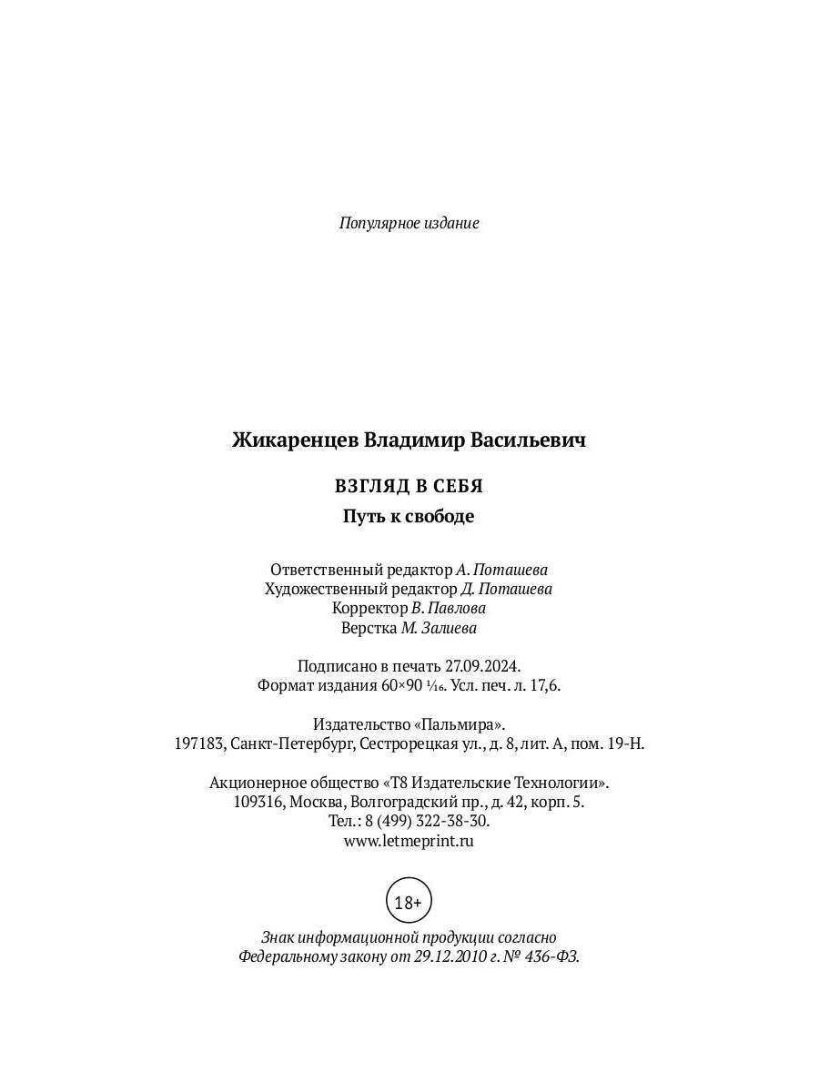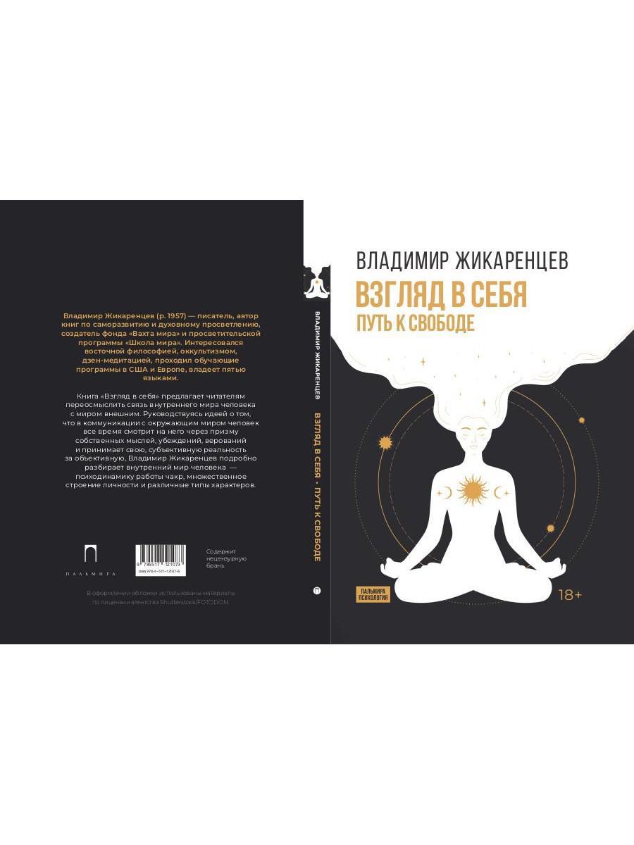 Handling time: 14 days Автор: Жикаренцев В.В., «Взгляд в себя. Путь к свободе»: Книга «Взгляд в себя» предлагает читателям переосмыслить связь внутреннего мира человека с миром внешним. Руководствуясь идеей о том, что в коммуникации с окружающим миром человек все время смотрит на него через призму собственных мыслей, убеждений, верований и принимает свою, субъективную реальность за объективную, Владимир Жикаренцев подробно разбирает внутренний мир человека — психодинамику работы чакр, множественное строение личности и различные типы характеров.