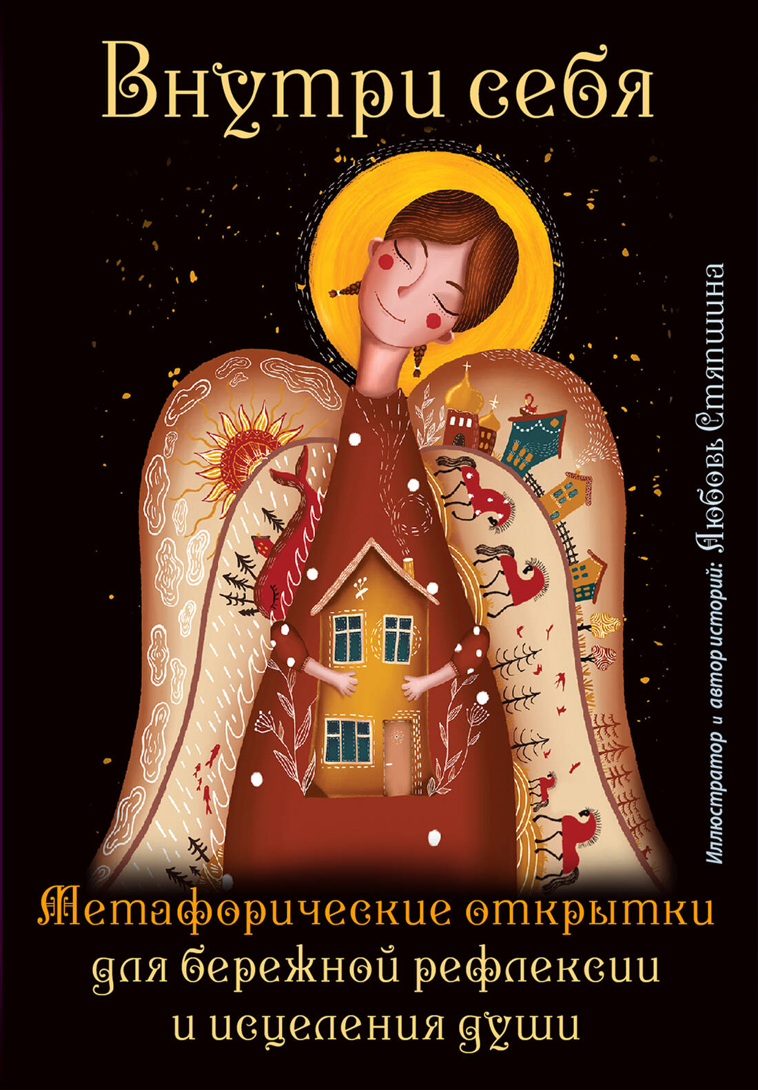 «Внутри себя» — набор из 20 наполняющих метафорических открыток и посланий для женщин от автора бестселлера «Прикоснись к себе» Любови Стяпшиной.«В моменты, когда западный ветер, путешествуя со стаей перелетных птиц, разносит тревожные вести, эта женщина нежно обнимает мир, стараясь не пропустить ни одного дома. В такие дни каждый может почувствовать ее любовь и присутствие», — тексты на открытках, словно древние песни — бережно баюкают и обнимают, шепчут слова поддержки и помогают окунуться в целительное творческое пространство.Глубокие и насыщенные цвета иллюстраций, контраст, которым пропитаны все изображения, позволяет находить в жизни множество индивидуально значимых нюансов. Автор соединяет в одной картине совершенно несочетаемые истории, бережно ведя нас за руку из одного мира — в другой. Из грусти — в радость. От чашки крепкого чая — к путешествию по просторам вселенной. То черничное небо, то ласковый океан, то ночь оплетают наши сердца ветром и прохладой. Обещая счастье.С каких планет прилетели ко мне все волшебные девушки и как могут помочь в решении моей проблемы?Почему на многих иллюстрациях повторяется один и тот же мотив — прорастающих сквозь чашки, плечи и дома ростков?На одних открытках у девушки есть лицо, а на других оно, словно специально, прикрыто каким-то необычным образом. Как мне это трактовать?Работа с метафорическими открытками — это не гадание, они не предсказывают будущее и не дают информацию ни о ком, кроме вас. То, что вы видите на изображении, и то, о чем читаете в истории, то, как вы себе объясняем увиденное, — и есть ключ к тем ответам, которые вы ищете. Берегите себя и будьте счастливы!Открытки можно использовать:- как профессиональный психологический инструмент в работе психологов, арт-терапевтов и специалистов других помогающих профессий;- как инструмент самопомощи для личного чтения.Также открытки выходят под названием «Женские миры. Метафорические открытки для бережной рефлексии и погружения в творческое пространство».