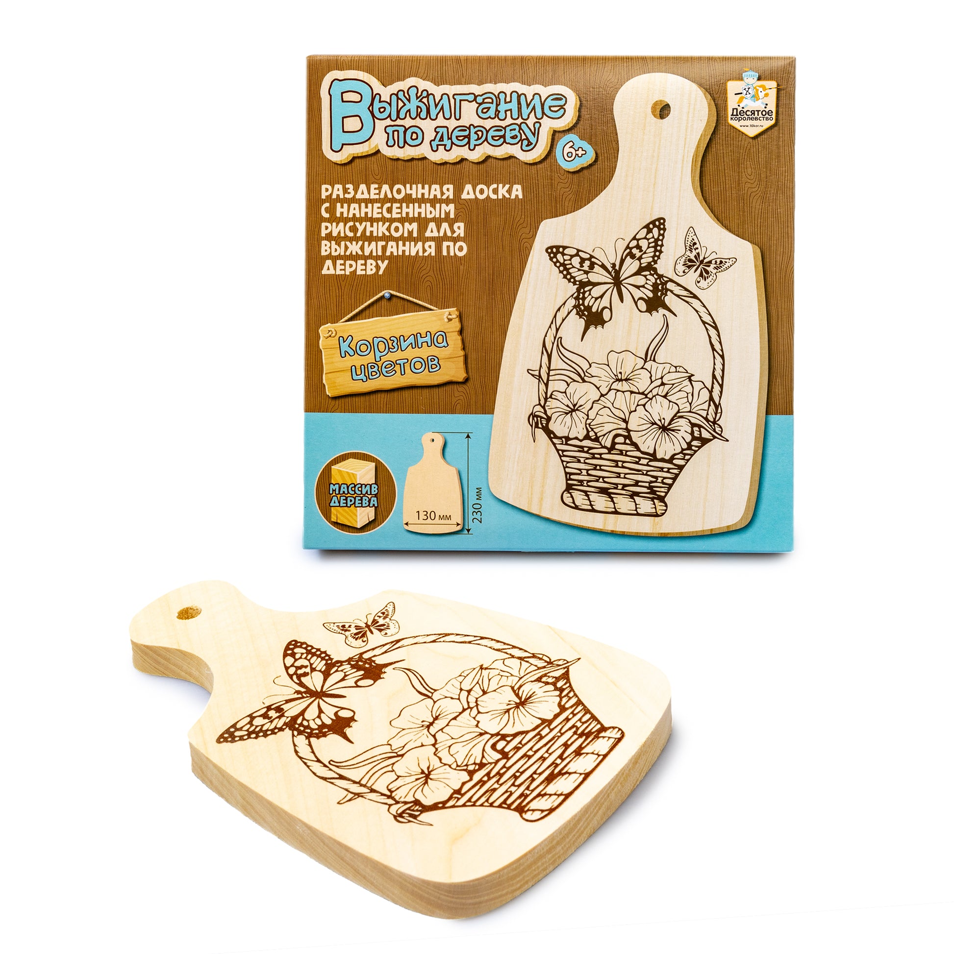 Handling time: 24 days Разделочная доска для выжигания с нанесённым рисунком «Корзина цветов». Состав: доска с рисунком – 1 шт. (13 х 23 см). Материал: массив дерева. Предназначено для детей от 6 лет. Творческий процесс выжигания развивает мелкую моторику рук, внимание, усидчивость и фантазию.