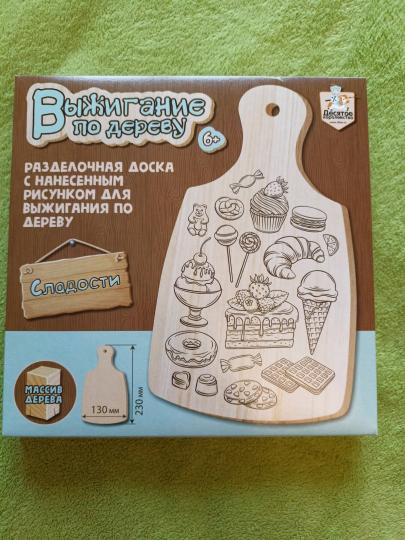 Handling time: 24 days Создай симпатичную картинку на разделочной доске из массива дерева. Навыки рисования не нужны, потому что на полотно уже нанесён простой линейный рисунок, который будет легко повторить.Состав:- доска с рисунком - 1 шт. (13 х 23 см)Предназначено для детей от 6 лет.Доска изготовлена из массива дерева, рисунок нанесён специальной краской, не выделяющей в процессе выжигания вредные вещества.С помощью выжигателя нанесите рисунок по линиям и у вас получится вкусная композиция из конфет.С этим набором ваш ребёнок легко освоит технику выжигания по дереву. Творческий процесс выжигания развивает мелкую моторику рук, внимание, усидчивость и фантазию.Сделано в России.