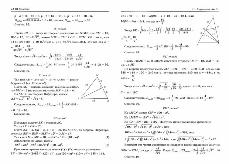 Предлагаемая книга посвящена решению одной и той же задачи, но разными способами.Количество приведенных способов - от 2 до 13, при этом используются оригинальные идеи и методы решений, которые способствуют повышению уровня и качества знаний, необходимых для успешной сдачи ЕГЭ по математике профильного уровня и победы на олимпиадах различного уровня.Решение одной и той же задачи разными способами дает возможность полнее исследовать свойства геометрической фигуры и выявить наиболее простые решения.Найденный способ решения в дальнейшем нередко используется при решении более трудных задач. При этом ученик развивает свои творческие возможности, формирует познавательный интерес, вырабатывает исследовательские навыки.В книге три параграфа, из которых первые два содержат подробные решения и обоснования задач планиметрии. В конце второго параграфа приведены задачи для самостоятельного решения, к которым даны ответы.В третьем параграфе приводятся избранные задачи на применение формул Пифагора, которые лишь упоминаются в учебнике геометрии.Кроме того, в книге имеются краткие теоретические сведения по всему курсу геометрии 7-9 классов.Книга адресована учащимся 7-11 классов, абитуриентам, учителям математики, репетиторам и всем любителям математики.
