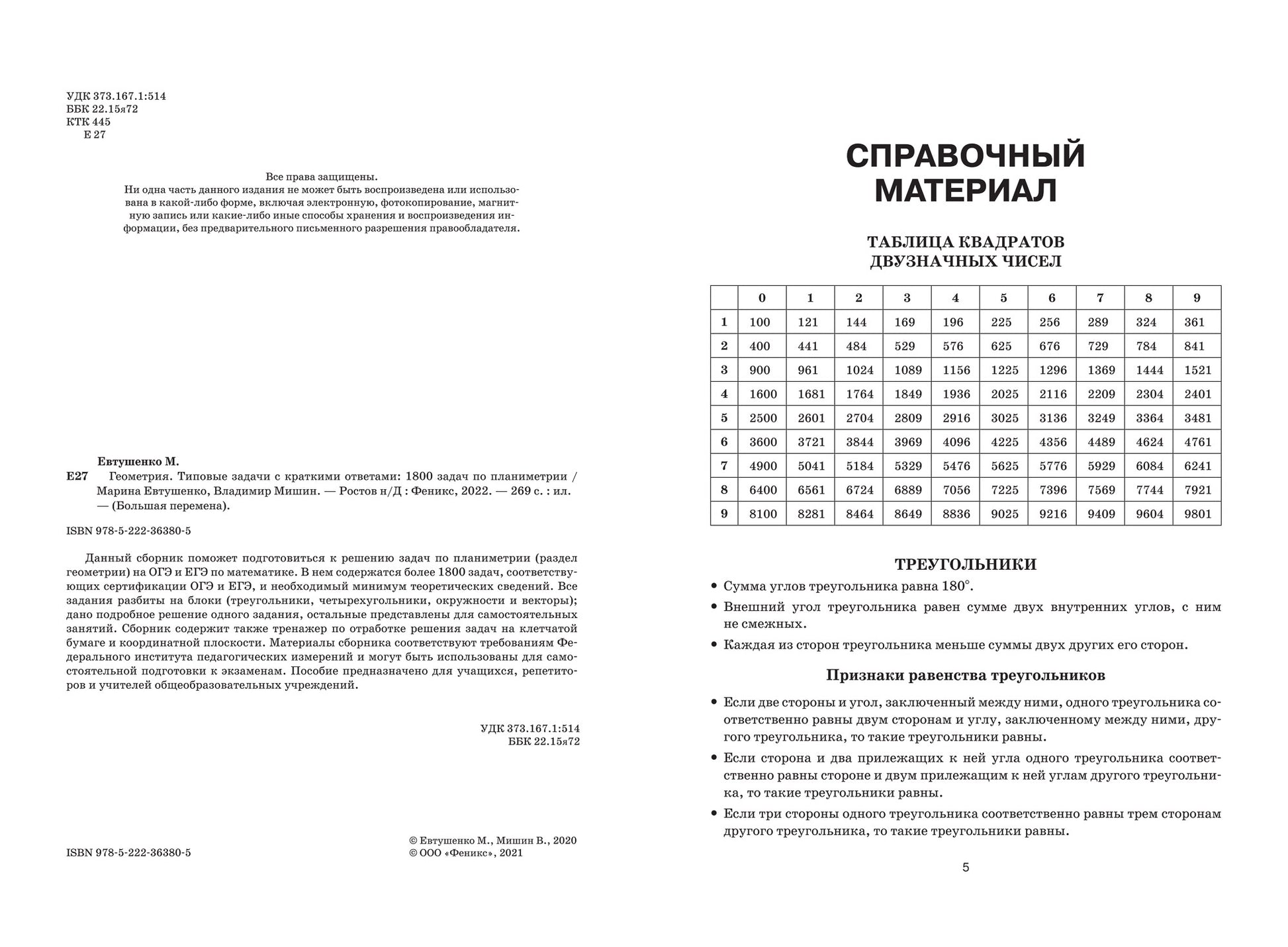 Данный сборник поможет подготовиться к решению задач по планиметрии (раздел геометрии) на ОГЭ и ЕГЭ по математике. В нем содержатся более 1800 задач, соответствующих сертификации ОГЭ и ЕГЭ, и необходимый минимум теоретических сведений. Все задания разбиты на блоки (треугольники, четырехугольники, окружности и векторы); дано подробное решение одного задания, остальные представлены для самостоятельных занятий. Сборник содержит также тренажер по отработке решения задач на клетчатой бумаге и координатной плоскости. Материалы сборника соответствуют требованиям Федерального института педагогических измерений и могут быть использованы для самостоятельной подготовки к экзаменам. Пособие предназначено для учащихся, репетиторов и учителей общеобразовательных учреждений.