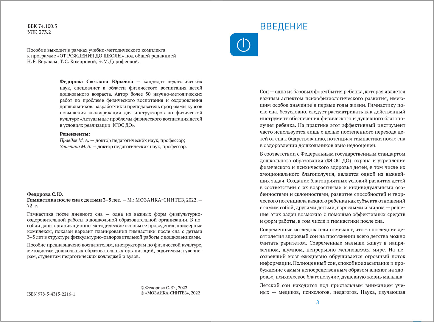 В пособии даны организационно-методические основы проведения гимнастики после сна, примерные комплексы, показан вариант планирования гимнастики после сна с детьми 3–5 лет в структуре физкультурно-оздоровительной работы с дошкольниками