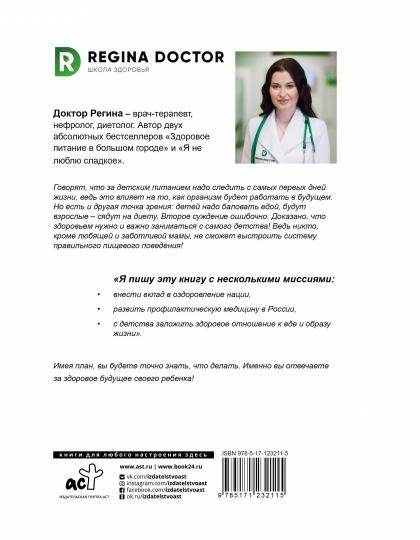 Доктор Регина – врач-терапевт, нефролог, диетолог. Автор двух абсолютных бестселлеров "Здоровое питание в большом городе" и "Я не люблю сладкое".Говорят, что за детским питанием надо следить с самых первых дней жизни, ведь это влияет на то, как организм будет работать в будущем. Но есть и другая точка зрения: детей надо баловать едой, будут взрослые – сядут на диету. Второе суждение ошибочно. Доказано, что здоровьем нужно и важно заниматься с самого детства! Ведь никто, кроме любящей и заботливой мамы, не сможет выстроить систему правильного пищевого поведения!"Я пишу эту книгу с несколькими миссиями:• внести вклад в оздоровление нации,• развить профилактическую медицину в России,• с детства заложить здоровое отношение к еде и образу жизни".Имея план, вы будете точно знать, что делать. Именно вы отвечаете за здоровое будущее своего ребенка! Пять причин купить 1Доктор Регина — врач-терапевт, нефролог, диетолог; автор бестселлера «Здоровое питание в большом городе». 2Книга поможет выстроить систему питания вашего ребенка и тем самым обеспечить ему здоровое будущее. 3Узнайте, как с детства заложить правильное отношение к еде, построенное на понимании, а не на запретах. 4Практическое приложение с самыми топовыми советами по детскому питанию. 5Атопический дерматит, заболевания ЖКТ и анемия — как избежать неприятных болезней, скорректировав детский рацион.