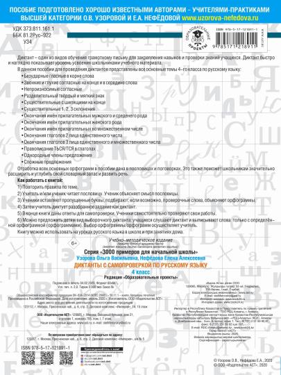 Диктант – один из видов обучения грамотному письму для закрепления навыков и проверки знаний учащихся. Диктант быстро и наглядно показывает уровень усвоения школьниками учебного материала.В данном пособии для проведения диктантов представлены все основные темы 4-го класса по русскому языку:Безударные гласные в корне словаЗвонкие и глухие согласные на конце и в середине словаНепроизносимые согласныеРазделительный твёрдый и мягкий знакСуществительные с шипящими на концеСуществительные 1, 2, 3 склоненияОкончания имён прилагательных мужского и среденего родаОкончания имён прилагательных женского родаОкончания имён прилагательных во множественном числеОкончания глаголов 2 лица единственного числаОкончания глаголов 3 лица единственного и множественного числаПравописание ТЬСЯ/ТСЯ в глаголахОднородные члены предложенияСложные предложенияОтработка всех основных орфограмм в пособии дана в пословицах и поговорках. Это также поможет школьникам значительно расширить и углубить свой словарный запас и развить речь.Как работать с книгой:1) Повторить правила по теме.2) Учитель и/или ученик читает пословицу. Ученик объясняет смысл пословицы.3) Ученики вставляют пропущенные буквы, подбирают, если возможно, проверочные слова, объясняют орфограммы.4) Затем учитель диктует разобранное задание как диктант.5) В конце книги даны ответы для самопроверки. Ученики самостоятельно проверяют свои работы.6) Можно предложить детям вид выборочного диктанта: учащиеся слушают диктант и выписывают слова только с определённой орфограммой (или орфограммами). Выбор орфограммы/орфограмм осуществляет учитель.Книгу можно использовать на уроках русского языка в школе и при занятиях дома.