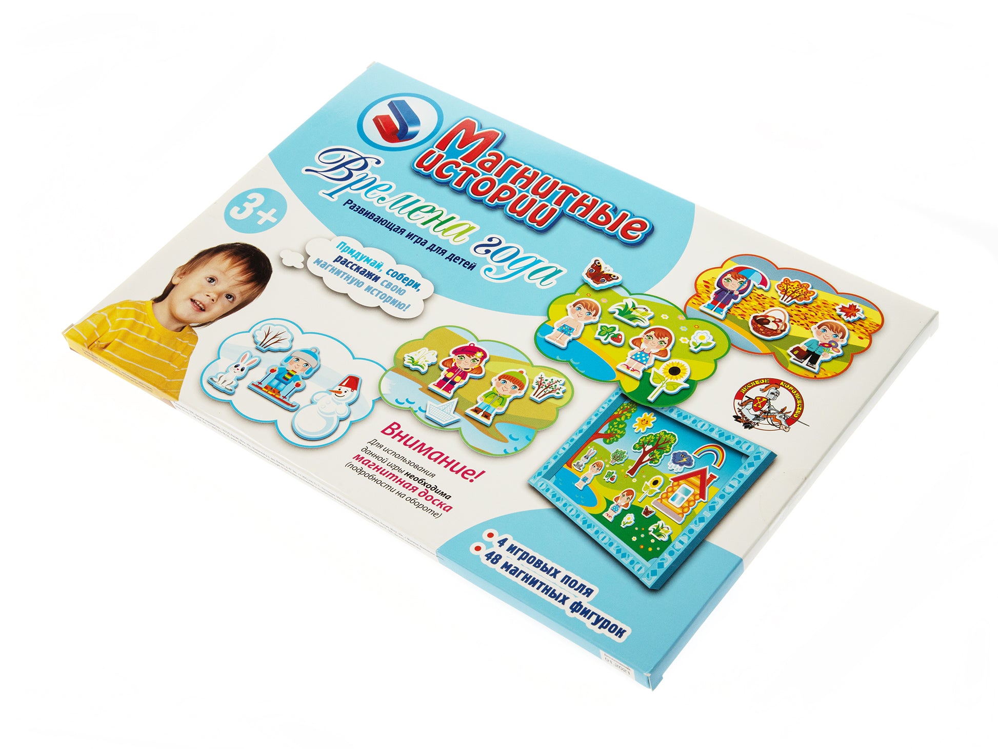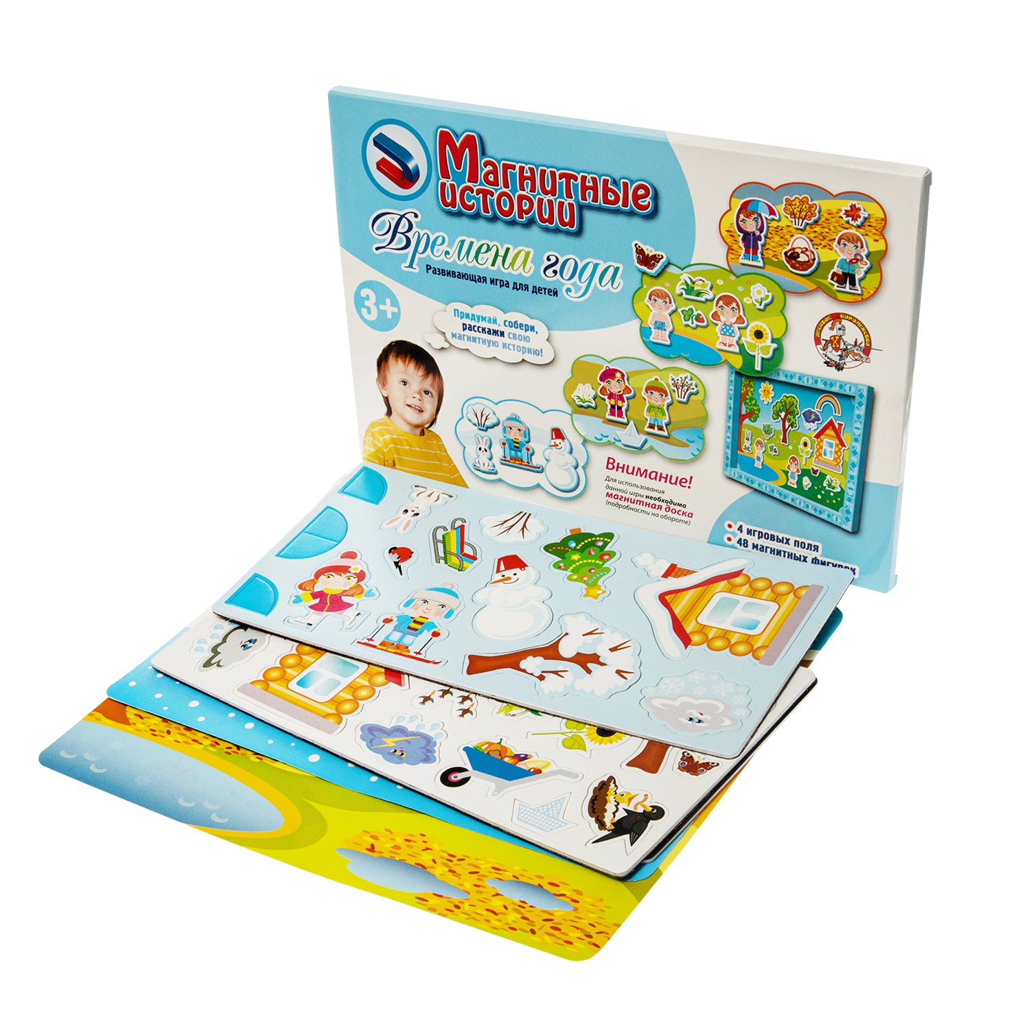 Обучающая развивающая игра, предназначенная для детей старше 3 лет. Дополнительный набор отличается от основного, артикул 01542, отсутствием магнитной доски. Если у вас уже имеется любая игра из серий «Магнитные истории» или «Пифагорики», планшет от нее подойдет к этому дополнительному набору и даст возможность сэкономить на покупке. Если же вы покупаете наши обучающие наборы впервые, предпочтительнее приобрести полноценную игру арт.01542 с магнитной доской.«Времена года» - познавательная для Вашего ребенка игра, позволяющая познакомиться с временами года, научиться понимать, чем зима, весна, лето и осень отличаются друг от друга.Выберите игровое поле, закрепите его на доске с помощью магнитных уголков и помогите ребенку подобрать, соответствующие выбранному полю фигурки. Магнитная основа поля позволяет фигуркам хорошо держаться на нем.Предлагается два варианта игры:1. Ребенок расставляет фигурки в соответствии с временем года.2. Взрослый создает намеренно неправильную «историю» и просит малыша найти ошибку.Надеемся, что наши игры помогут вашему ребенку в познании окружающего нас многогранного и разнообразного мира.Если Вы решили купить развивающую игру «Магнитные истории» в нашем интернет-магазине Десятое королевство, то можете рассчитывать получить гарантированную скидку.