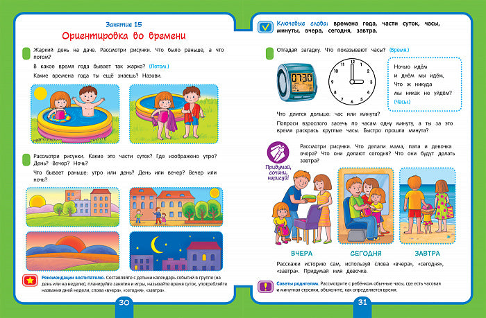 Дорогие воспитатели и родители! Предлагаем вашему вниманию комплект рабочих тетрадей для занятий с дошкольниками в детском саду и дома по главным направлениям подготовки к школе. УНИВЕРСАЛЬНЫЙ, СОВРЕМЕННЫЙ, ТРАДИЦИОННЫЙ По комплекту можно работать в любом детском саду: в нём учтены требования современных образовательных программ дошкольного образования, Федерального государственного образовательного стандарта дошкольного образования (ФГОС ДО). Авторы сохранили лучшие традиционные методические находки. ПОЧЕМУ ЭТОТ КОМПЛЕКТ ВЫБИРАЮТ ВОСПИТАТЕЛИ? Комплект разработан авторами на основе общих подходов. Во всех тетрадях — одинаковые обозначения и оформление. Авторы комплекта — известные методисты, педагоги, учёные, хорошо знакомые широкому кругу воспитателей и родителей. ПОЧЕМУ ЭТОТ КОМПЛЕКТ ВЫБИРАЮТ РОДИТЕЛИ? В какой бы детский сад ни ходил ваш малыш, развивающие тетради помогут ему получить именно те знания и навыки, которые в это время прорабатываются с детьми в детском саду. Ваш ребёнок всегда будет вместе со всеми, возможно, даже впереди всех. ПОЧЕМУ ЭТОТ КОМПЛЕКТ ВЫБИРАЮТ ДЕТИ? Ваш малыш никогда не заскучает, рассматривая яркие рисунки и выполняя увлекательные задания. ПЛАНИРОВАНИЕ ЗАНЯТИЙ И ТРЕБОВАНИЯ К РЕЗУЛЬТАТУ В каждой развивающей тетради на последней странице в таблице представлены темы занятий, ключевые слова, основные знания и навыки, которые формируются на каждом занятии; примерные сроки проведения занятий. Текст заданий предназначен для чтения взрослыми детям. Во всех тетрадях комплекта присутствуют задания, которые комплексно развивают ребёнка.