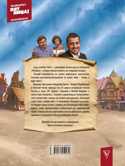 "Еда, я люблю тебя!" - кулинарное тревел-шоу на телеканале "Пятница!", которое нельзя смотреть на голодный желудок.Лучший путеводитель по самым необычным, аппетитным, вкусным достопримечательностям по всему миру - теперь в виде книги.Ведущие программы Владимир Дантес, Эдуард Мацаберидзе и Николай Камка проведут вас по самым интересным местам России и стран СНГ, Европы, Северной и Южной Америки, а также Азии. Окунитесь с головой в удивительное гастрономическое путешествие, которое не оставит равнодушным.Благодаря книге "Еда, я люблю тебя!" от телеканала "Пятница!" вы узнаете каждую страну на вкус, узнаете, что обязательно стоит попробовать, чтобы прочувствовать аутентичный дух национальной кухни. А также сможете приготовить все на своей кухне, удивить любимых и порадовать себя разнообразием вкусов.Обещаем, вы не останетесь равнодушны. Просто пальчики оближете! Пять причин купить 1.Посетите сразу 30 стран и 35 городов мира. 2.10 лучших блюд в каждом из предложенных городов. 3.Список любимых ресторанов ведущих программы. 4.Вы научитесь готовить изысканные лакомства — в книге представлены рецепты некоторых блюд. 5.У вас разыграется аппетит не только к еде, но и к путешествиям.